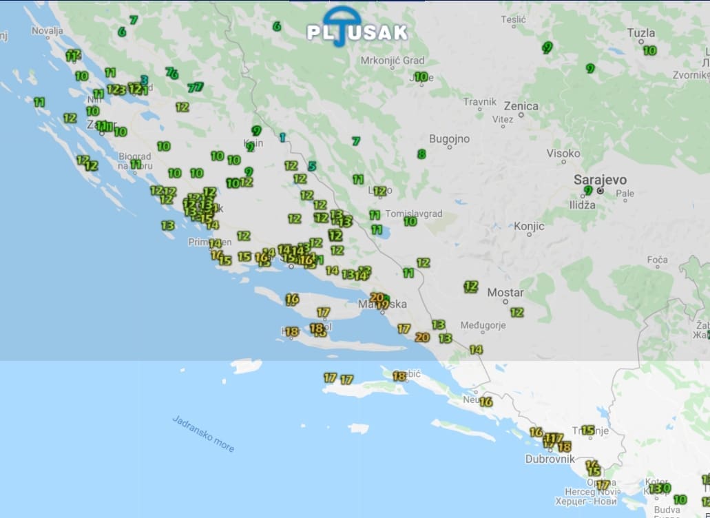 Dok je na sjeveru Dalmacije zapuhala bura, u južnoj i daje dominira jugo. Osjeti se to itekako po temperaturi zraka. Primjerice, na makarskom području temperature zraka u 23 sata dosezale su za dio godine iznimno toplih 20°C. U isto vrijeme Zadar mjeri 11°C, Knin 9°C, a Sinjal, najviši vrh Hrvatske (Dinara) mjeri 0°C uz snježne oborine.