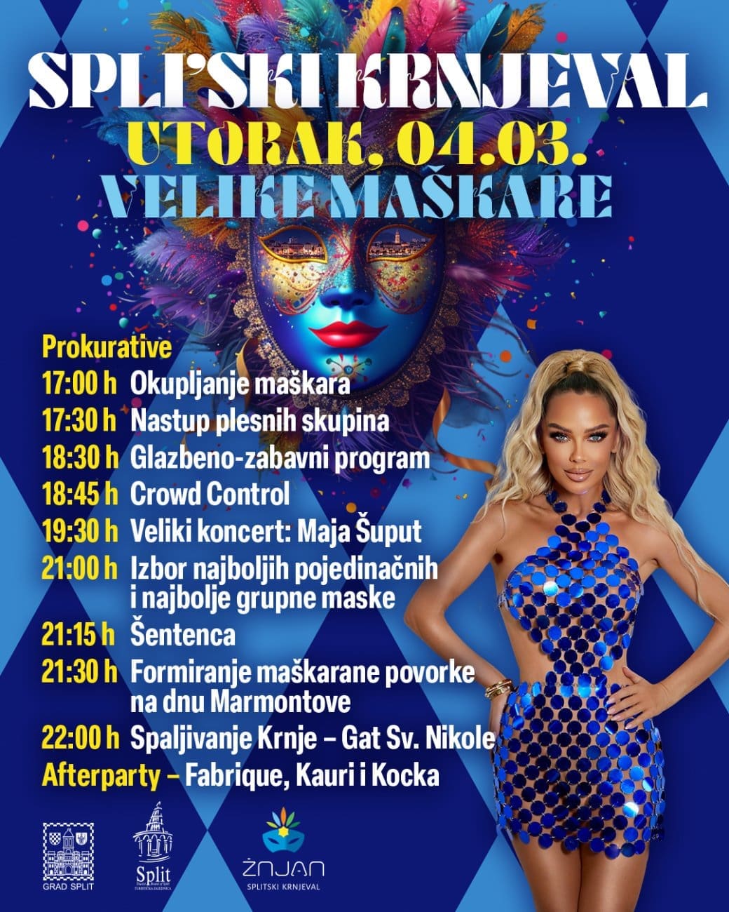 Spli'ski krnjeval nastavlja se sutra, kada nas na pokladni utorak na Prokurativama čeka velika završnica uz koncert Maje Šuput, čitanje Šentence, veliku povorku i paljenje Krnje!