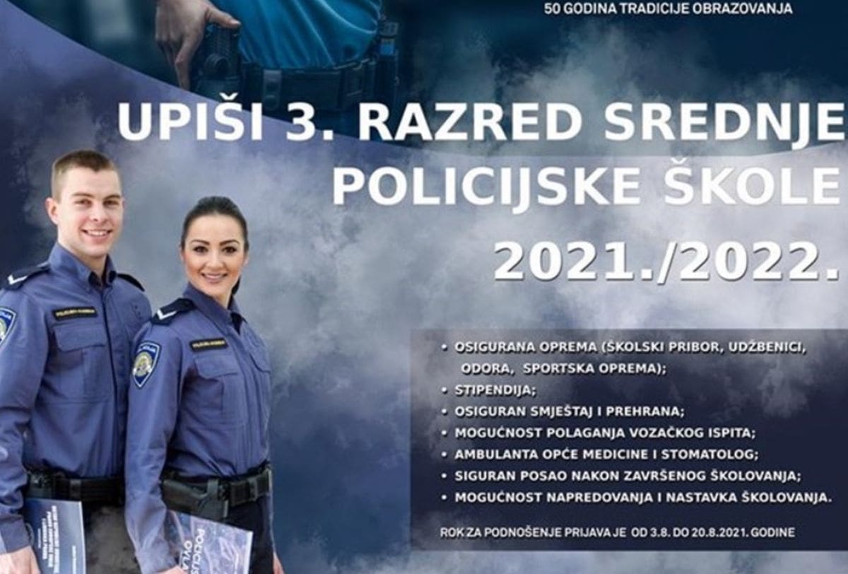 Svi zainteresirani srednjoškolci koji zadovoljavaju uvjete, od 3. do 20. kolovoza 2021. godine mogu se prijaviti na natječaj Policijske akademije za upis u program redovitoga srednjoškolskog obrazovanja kroz 3. i 4. razred, kojim će steći kvalifikaciju za obavljanje policijskog posla.