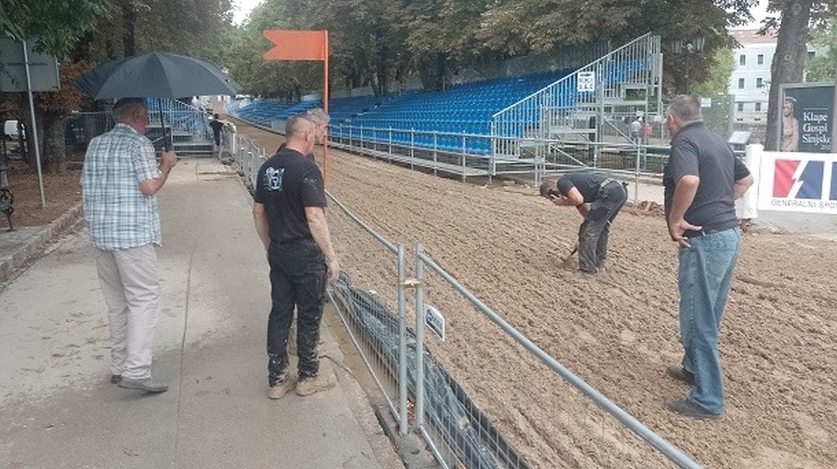 U Sinju povremeno pada slaba kiša, no unatoč tome služba zadužena za održavanje staze je na Alkarskom trkalištu.