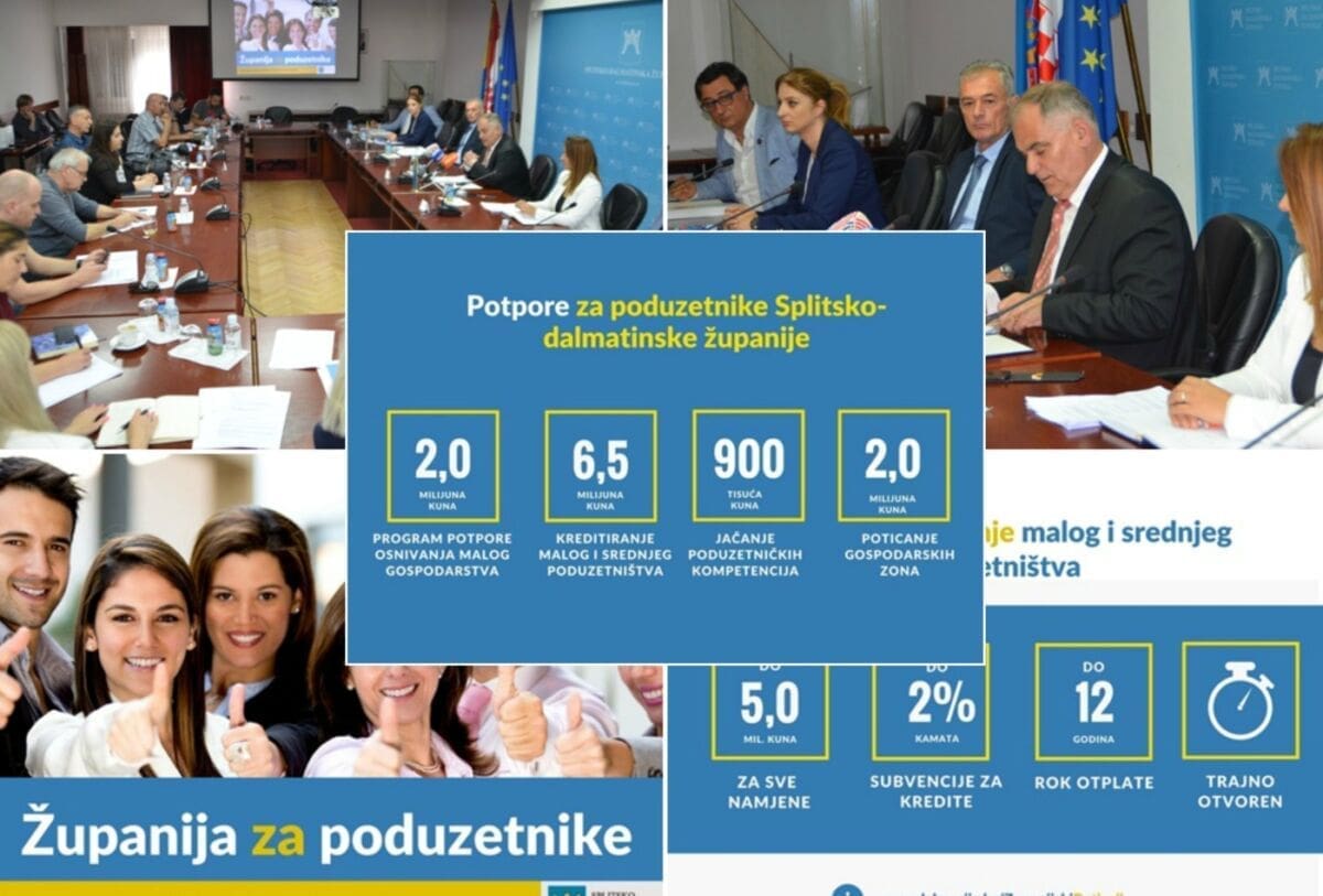 Danas je Splitsko-dalmatinska županija predstavila paket mjera poduzetničkih potpora. Tako je za poduzetnike početnike pripremljen program potpore osnivanja malog gospodarstva, za sve poduzetnike kreditiranje malog i srednjeg poduzetništva, za one koji će tek postati poduzetnici jačanje poduzetničkih kompetencija, a za jednake poduzetničke mogućnosti poticat će gospodarske zone. Ukupan paket mjera "težak" je 35 milijuna kuna, a samo su 4 mjere potpore za poduzetnike Županije "teške" 11,5 milijuna kuna.