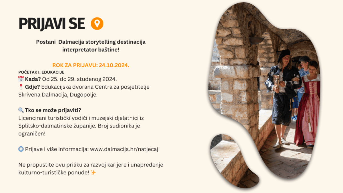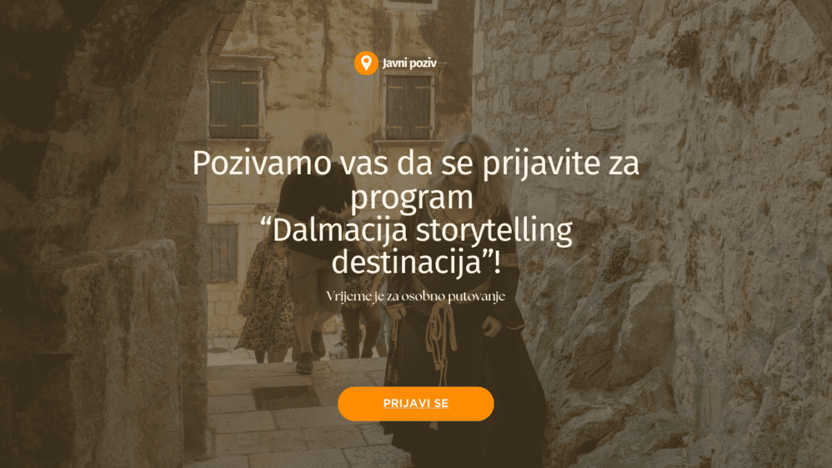 Upravni odjel za turizam, pomorstvo i promet Splitsko-dalmatinske županije s ponosom najavljuje javni poziv za prijavu sudionika u program Dalmacija storytelling destinacija. Rok za prijavu je 24.10.2024. godine.