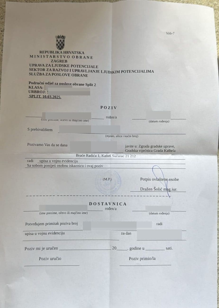 Pojedinačni pozivi za upis u vojnu evidenciju dolazit će tijekom ožujka i travnja 2025. godine na adrese vojnih obveznika rođenih 2007. godine, a pozive će uputiti područni odjeli za poslove obrane na čijem području osobe imaju prebivalište. Pozvane osobe obvezne su se odazvati u zakazanom terminu te prilikom dolaska predočiti osobnu iskaznicu ili domovnicu i OIB.
