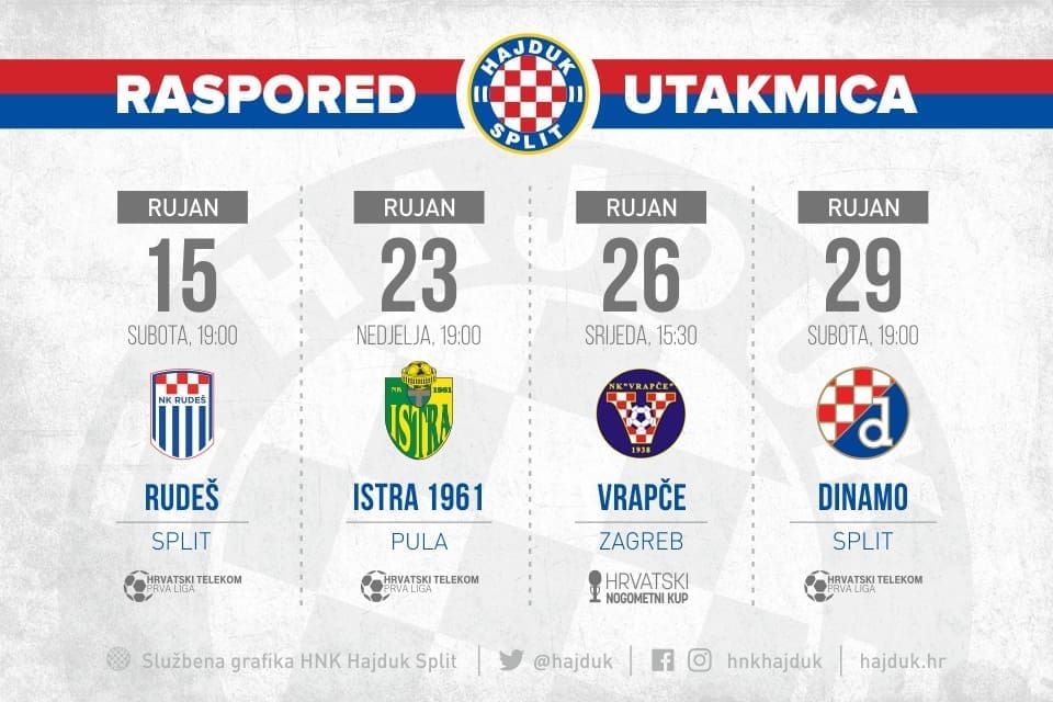 Najprije hajdukovci na svom stadionu dočekuju momčad Rudeša. Susret protiv Zagrepčana na rasporedu je u subotu 15. rujna s početkom 19 sati. Osam dana poslije Bijeli gostuju u Puli protiv Istre 1961, a početak dvoboja je u 19 sati.
