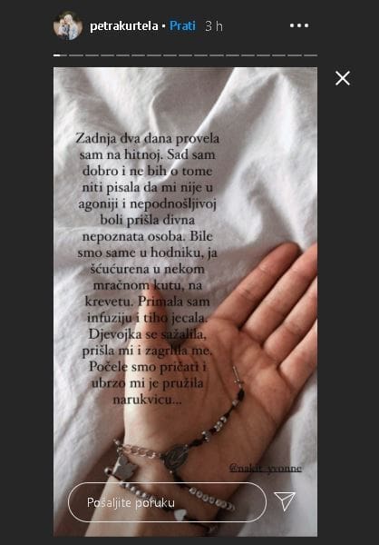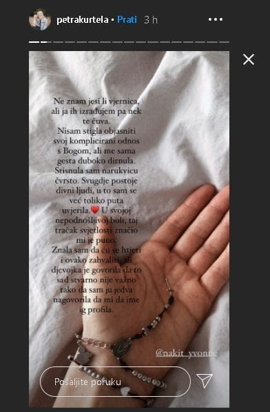 Nisam stigla objasniti svoj komplicirani odnos s Bogom, ali me sama gesta duboko dirnula. Stisnula sam narukvicu čvrsto. Svugdje postoje divni ljudi, u to sam se već toliko puta uvjerila. U svojoj nepodnošljivoj boli taj tračak svjetlosti značio mi je puno. Znala sam da ću se htjeti i ovako zahvaliti, ali djevojka je govorila da to sad stvarno nije važno… Jedva sam ju nagovorila da mi da ime svog Instagram profila" - napisala je Petra na Storyju svoga Insgtagrama.