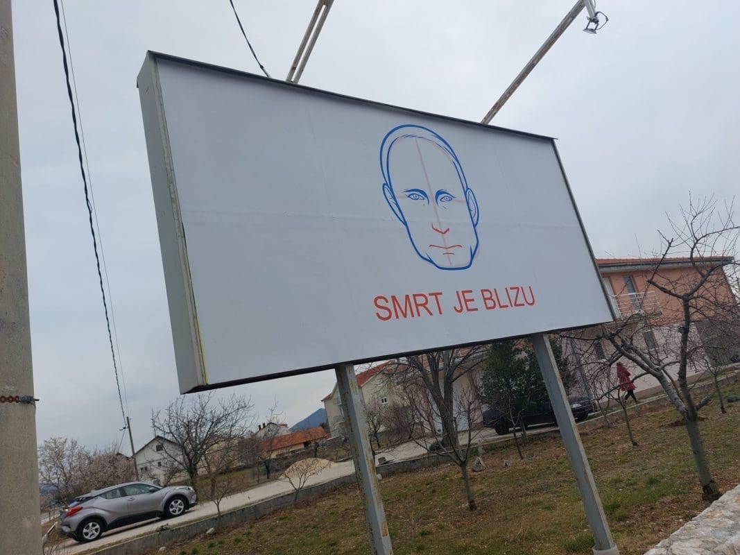 Na jednoj strani plakata je crtež ruskog predsjednika Borisa Putina ispod kojeg piše "Smrt je blizu".