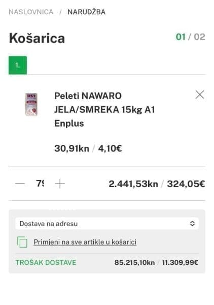 Na društvenim mrežama proširila se objava jednog korisnika koji je pokušao naručiti pelete preko web shopa, po cijeni od 30,91 kunu. Radi se o peletima Nawaro jela/smretka 15kg A1 Enplus.