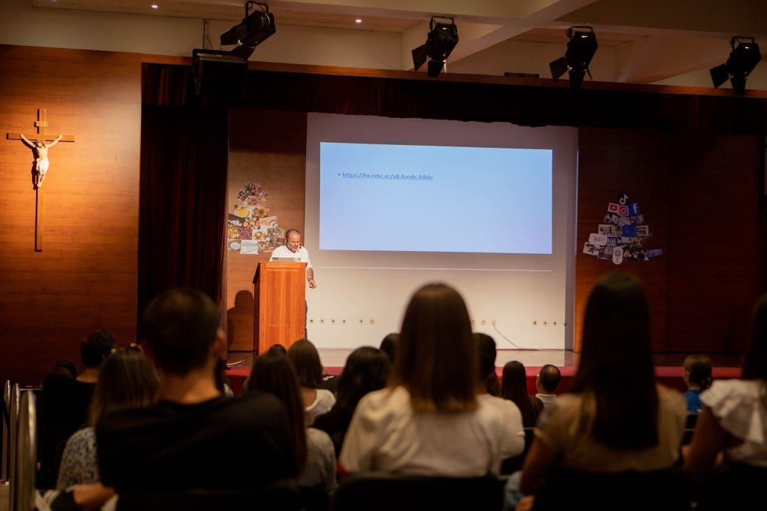 Anoreksija je vrlo kompleksan psihički poremećaj od kojeg najčešće pate mlade djevojke koje nisu zadovoljne tjelesnom masom pa imaju iskrivljenu sliku vlastitog tijela. „U takvom se poremećaju javlja opsesija za sve manjim unosom hrane, restrikcijom, prečestim i intenzivnim vježbanjem te, u konačnici, odbijanjem uzimanja hrane. Takve djevojke su često osobe niskoga samopoštovanja koje žele imati kontrolu nad nečim pa ju imaju nad hranom“, pojašnjava predavač. Emocionalno prejedanje izaziva osjećaj ispunjenosti jer osoba potiče proizvodnju hormona sreće koji joj predstavlja zadovoljstvo. Dr. Franić također ističe kako postoje određeni simptomi po kojima možemo prepoznati ove poremećaje u svojoj okolini. Nagli gubitak tjelesne mase u kratkom vremenskom razdoblju te suha i hladna koža samo su neki od znakova na koje treba reagirat, prije svega: reagirati razgovorom s tom osobom. Što se tiče djece i njihovoga stava prema hrani, predavač naglašava kako je potrebno djeci primjerom pokazati što je ispravno jer djeca oponašaju. Ukoliko roditelji i starija braća i sestre jedu redovito, raznovrsno i umjereno, utoliko će i dijete imati pozitivan stav prema hrani. Dr. Franić na kraju je svoga predavanja mladima istaknuo da trebaju imati pozitivnu društvenu mrežu oko sebe. Vršnjaci su vrlo važni i treba birati s kime se družiti, a roditelji nisu neprijatelji nego žele dobro za svoju djecu. „Zdrav odnos s prijateljima treba razvijati kroz razgovor i dijeljenje osjećaja i emocija. Ako primijetiš problem, razgovaraj. Traži i pružaj pomoć. Oblikuj, pitaj i vjeruj“, poručuje predavač.