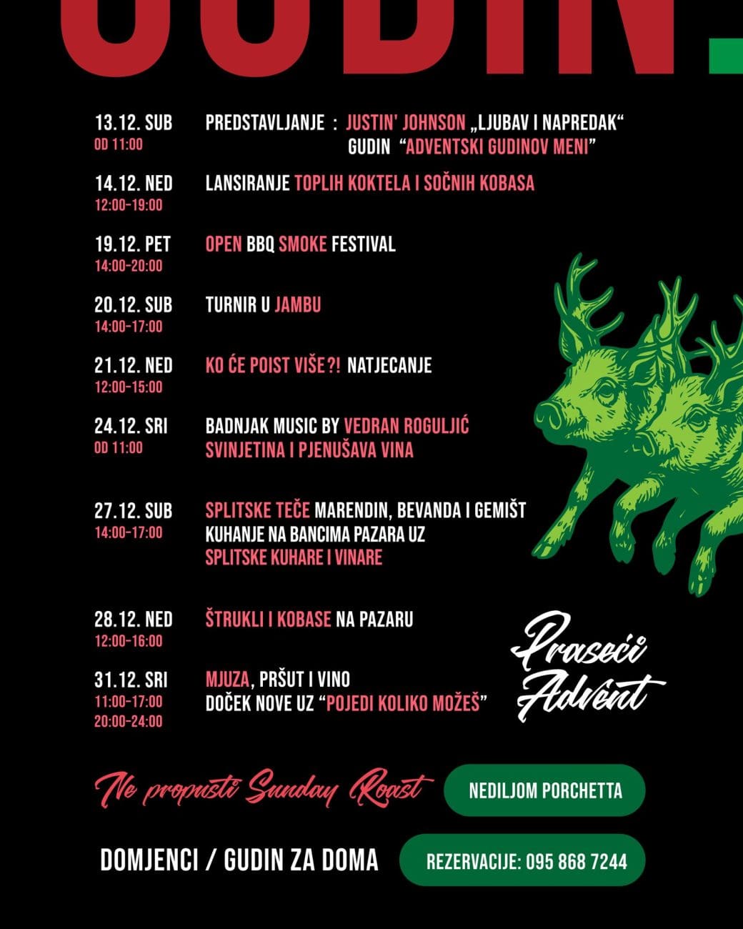 Za sve koji bi dio Adventa preselili na vlastiti stol – bilo kroz domjenke ili opciju "Gudin za doma" – dostupne su informacije i rezervacije na broj: 095 868 7244.