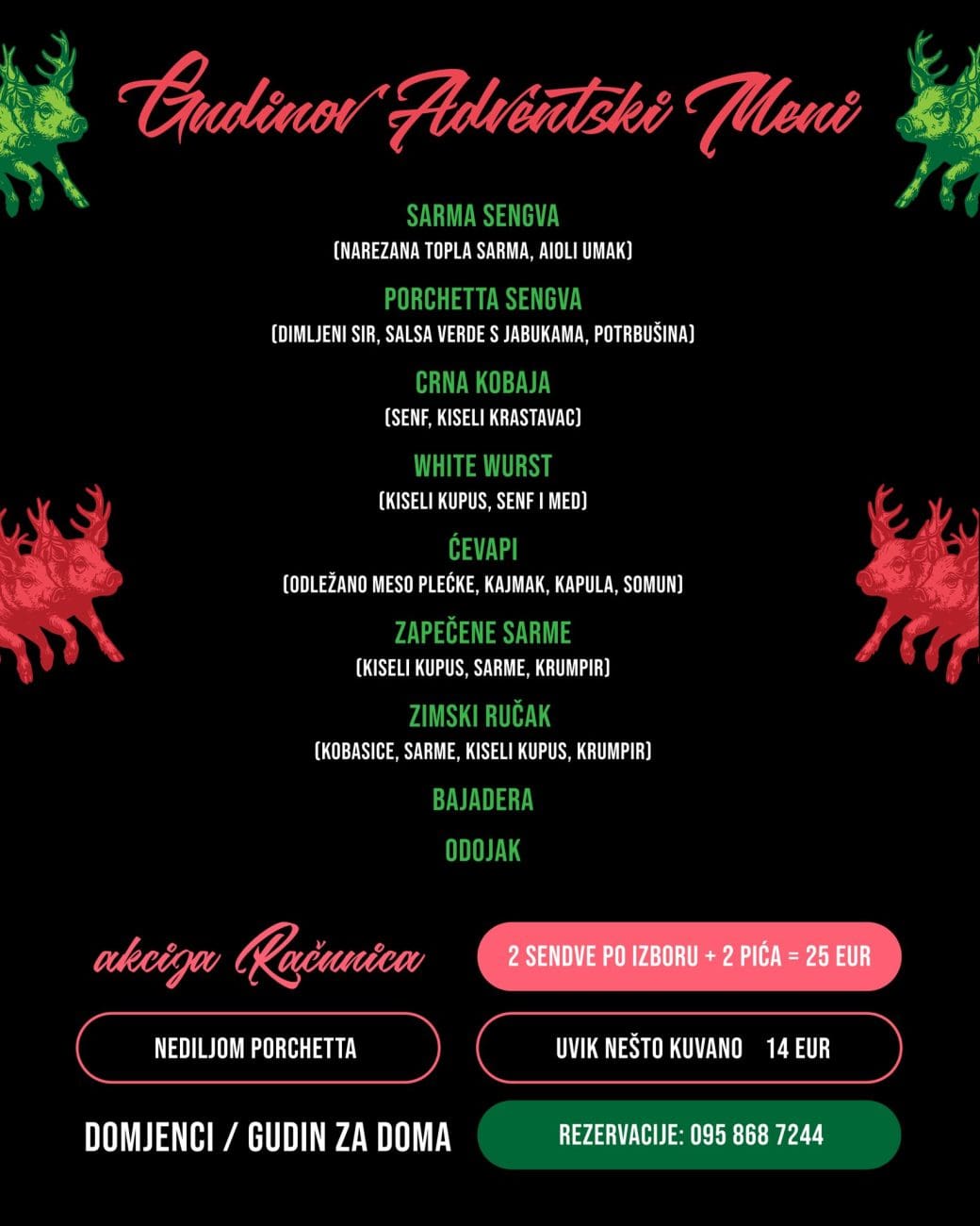 Za sve koji bi dio Adventa preselili na vlastiti stol – bilo kroz domjenke ili opciju "Gudin za doma" – dostupne su informacije i rezervacije na broj: 095 868 7244.