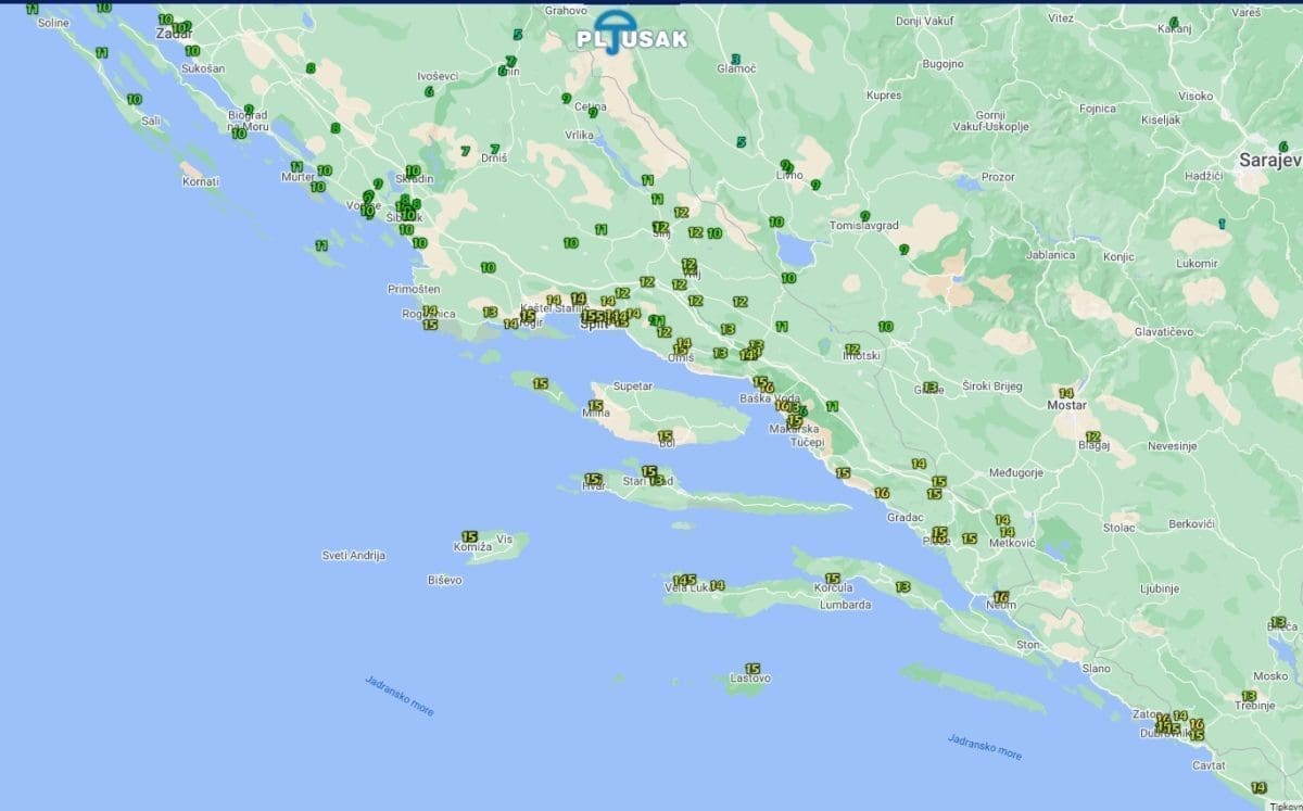 Ostatak dana prevladavat će oblačno vrijeme uz povremenu kišu, a prema večeri sa sjevera stiže djelomično razvedravanje. Puhat će većinom umjerena, na sjevernom dijelu ponegdje i jaka bura te sjeverozapadnjak, na jugu još i jugozapadnjak. Najviša temperatura od 14 do 18 °C.