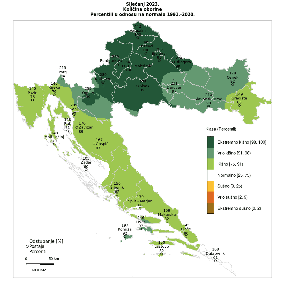 Također očekivano, u većem dijelu Dalmacije siječanj je oborinski bio natprosječan mjesec. To se osobito osjetilo na srednjodalmatinskim otocima, a prosječne oborine dobili su tek zadarsko i dubrovačko područje.