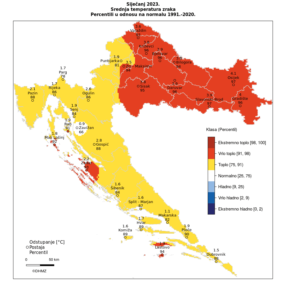 DHMZ je nedavno objavio klimatološku analizu siječnja 2023. Za ljubitelje klimatoloških podataka vrlo je zanimljiva vijest da su naši klimatolozi prvi put o ovoj analizi koristili najnoviji klimatološki prosjek, a to je onaj od 1991. do 2000. Ovo je bitno jer u dobu globalnog zagrijavanja stariji prosjeci gotovo da su irelevantni kada ih koristimo kao referentno razdoblje za usporedbu s posljednjim godinama. Tako je siječanj 2023. očekivani u cijeloj Hrvatskoj bio topliji, a odstupanje je najizraženije bilo u Slavoniji. Veći dio Dalmacije dobio je ocjenu "toplo", a nema sumnje da bi ocjena bila još "toplija" da se nije dogodilo zahlađenje u posljednjoj dekadi mjeseca.