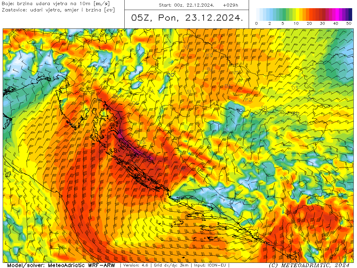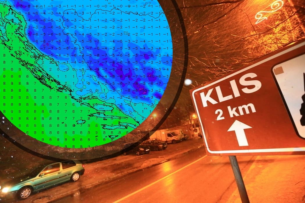 Danas nas očekuje oblačno s kišom, susnježicom i snijegom. Uz obalu i na otocima će padati kiše, ponegdje će biti pljuskova s grmljavinom i tučom, a mjestimice će pasti preko 40 litara oborine po metru kvadratnome. U Dalmatinskoj zagori u planinama će padati snijeg, a popodne će snijega biti i u nižim predjelima te će se stvarati snježni pokrivač. Susnježice, i snijeg bez snježnog pokrivača može biti ponegdje uz obalu i višim predjelima otoka u drugom dijelu dana. Oborine će prvo prestati na sjevernom Jadranu, a prestanak oborina postupno će se širiti i na srednji popodne i navečer. U noći još jako jugo, okretat će na moru na lebić i pulenat, a bura će se već u noći proširiti sa sjevernog Jadrana prema srednjem. Lebić će se najduže zadržati na dubrovačkom području. Bura će biti jaka s olujnim udarima, podno Velebita orkanskim. Očekuju se veći problemi u cestovnom prometu i prometu morem. Noć i jutro će biti najtopliji dio dana, danju sve hladnije, osobito u sjevernoj i srednjoj Dalmaciji. Sredinom dana bi će od 0°C ponegdje u Dalmatinskoj zagori do 12°C na jugu.
