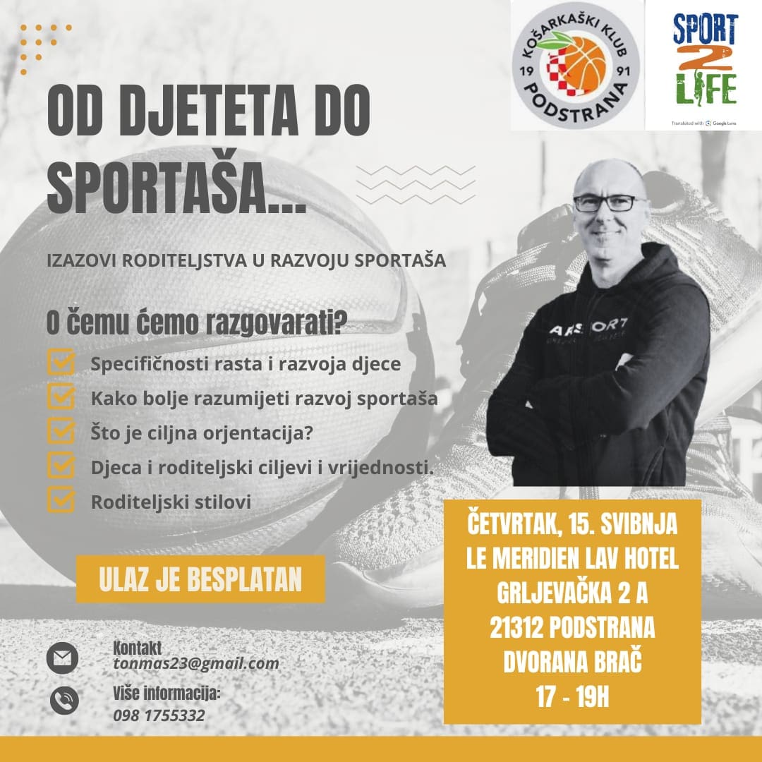 U četvrtak 15. svibnja s početkom u 17 sati u hotelu Le Meridien, dvorana Brač, na adresi Grljevačka 2a, Podstrana, održat će se edukativno predavanje dr.sc. Tonćija Mašine „Od djeteta do sportaša: Izazovi roditeljstva u razvoju sportaša“ namijenjeno roditeljima, trenerima, profesijama koji su vezane uz odgoj i razvoj djeteta te svima koji žele bolje razumjeti ulogu koje roditeljstvo igra u životu mladih sportaša.