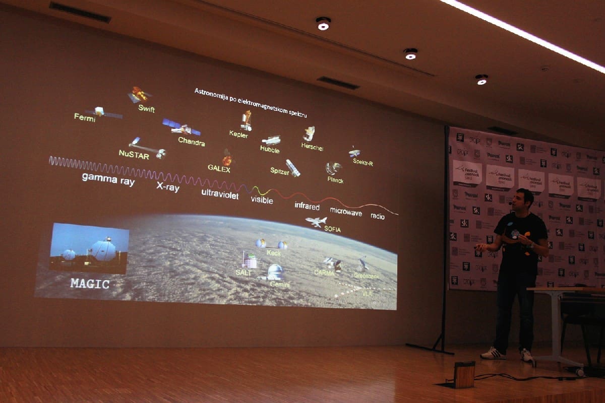 Predavač je prisutne upoznao s motivacijom koja stoji iza proučavanja najenergičnijih procesa u svemiru, izvorima zračenja najviših energija, te uređajima i metodama koje se primijenjuju u međunarodnom istraživačkom projektu MAGIC, u kojemu i sam sudjeluje.