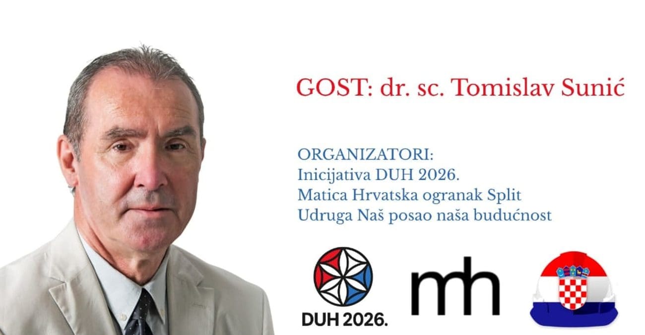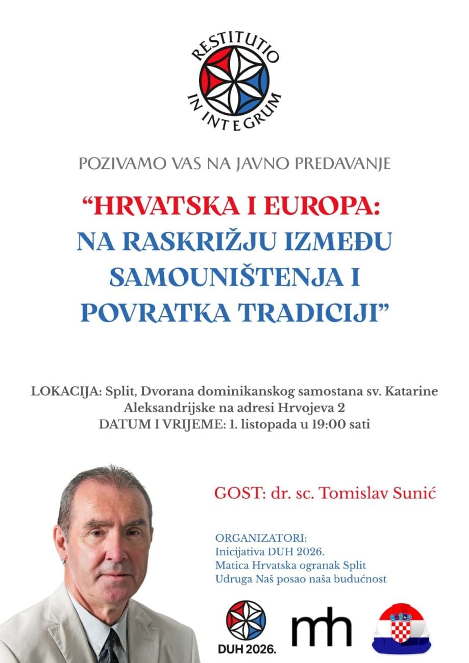 Predavanje i tribina nose naslov "Hrvatska i Europa: na raskrižju između samouništenja i povratka tradiciji", a početak je zakazan za 19 sati. Organizatori događaja su Matica Hrvatska – ogranak Split, udruga Naš posao, naša budućnost i inicijativa DUH 2026.