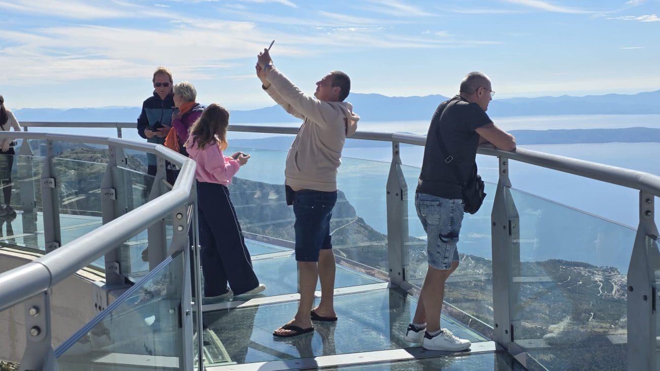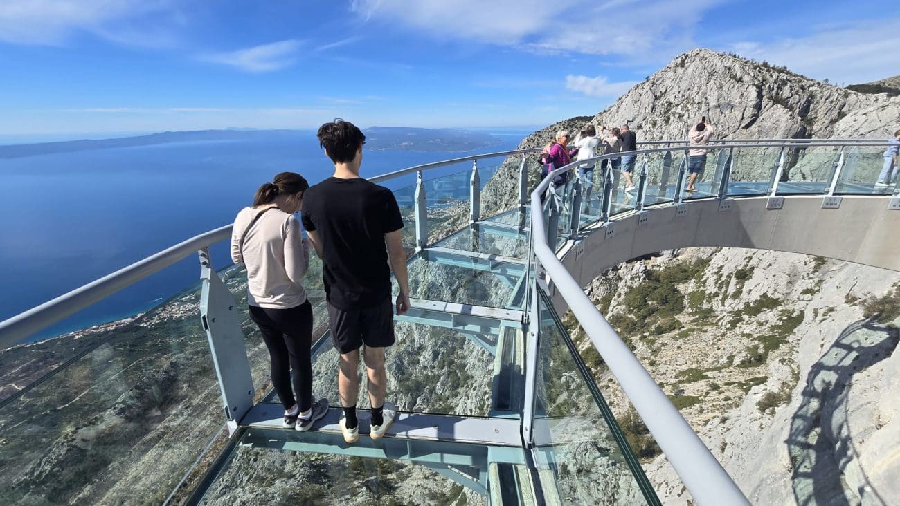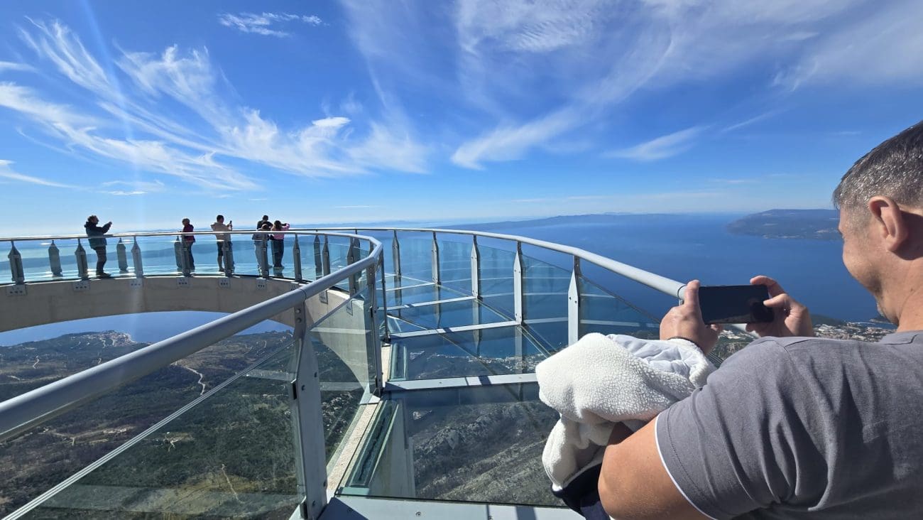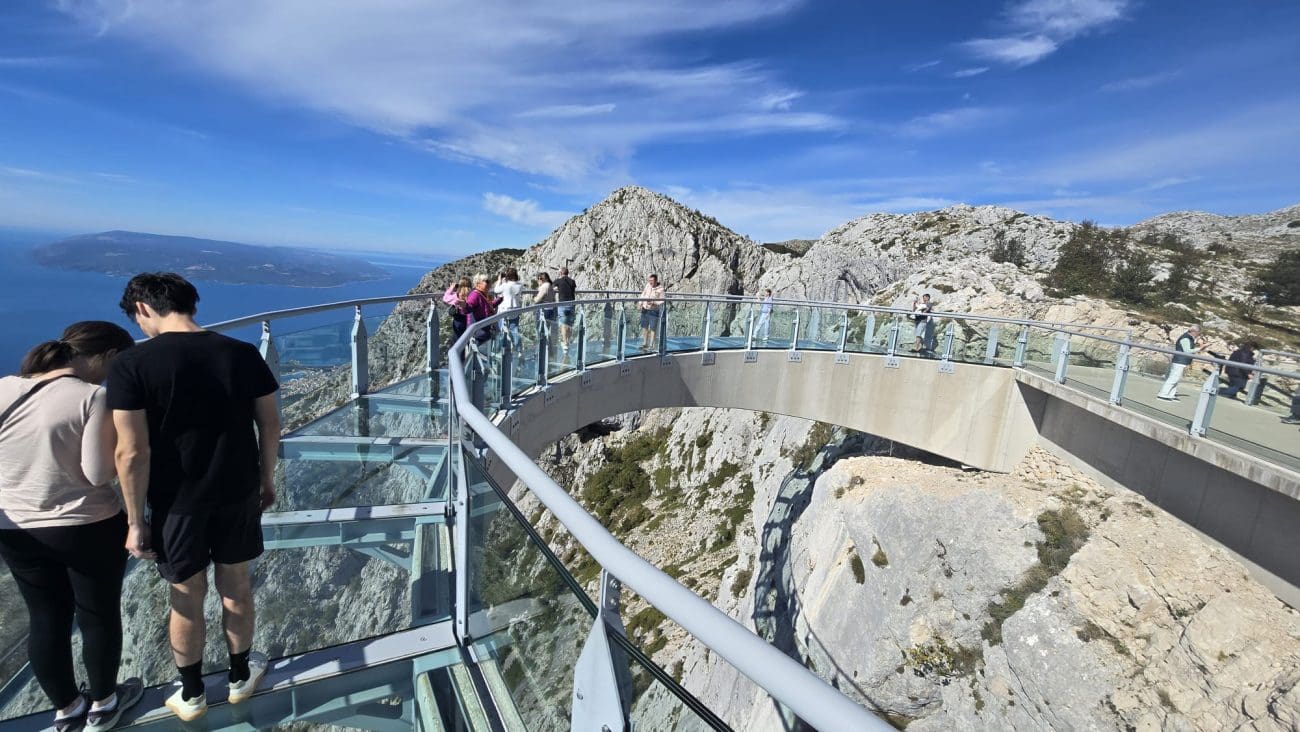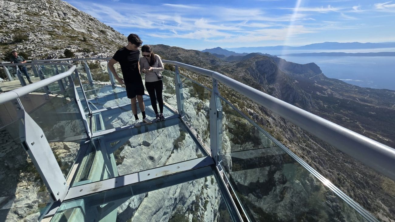 Smješten na 1228 metara nadmorske visine, ovaj stakleni vidikovac u Parku prirode Biokovo nudi nezaboravan pogled na makarsku rivijeru, otoke, a za vedrih dana čak i talijansku obalu s druge strane Jadrana. Danas su ga posjetili brojni domaći i strani turisti, ali i lokalni izletnici koji su odlučili iskoristiti idealne vremenske uvjete za boravak u prirodi.