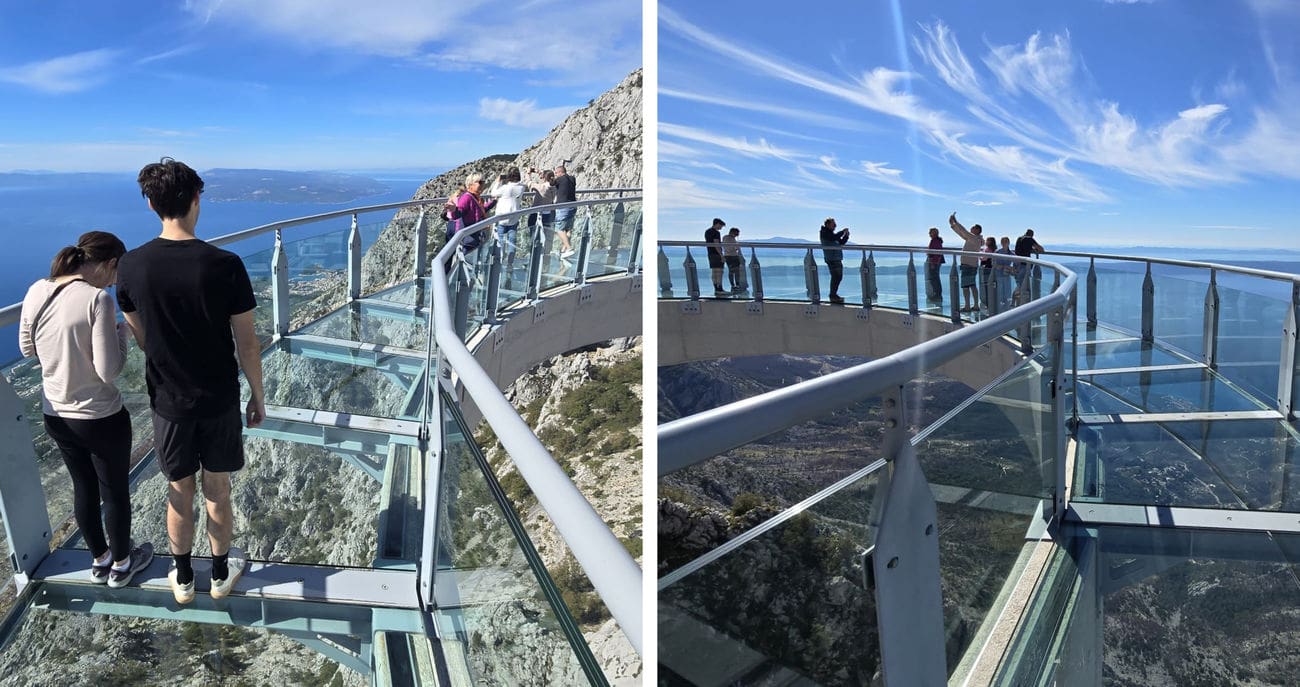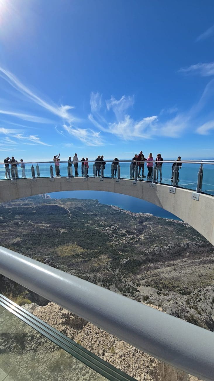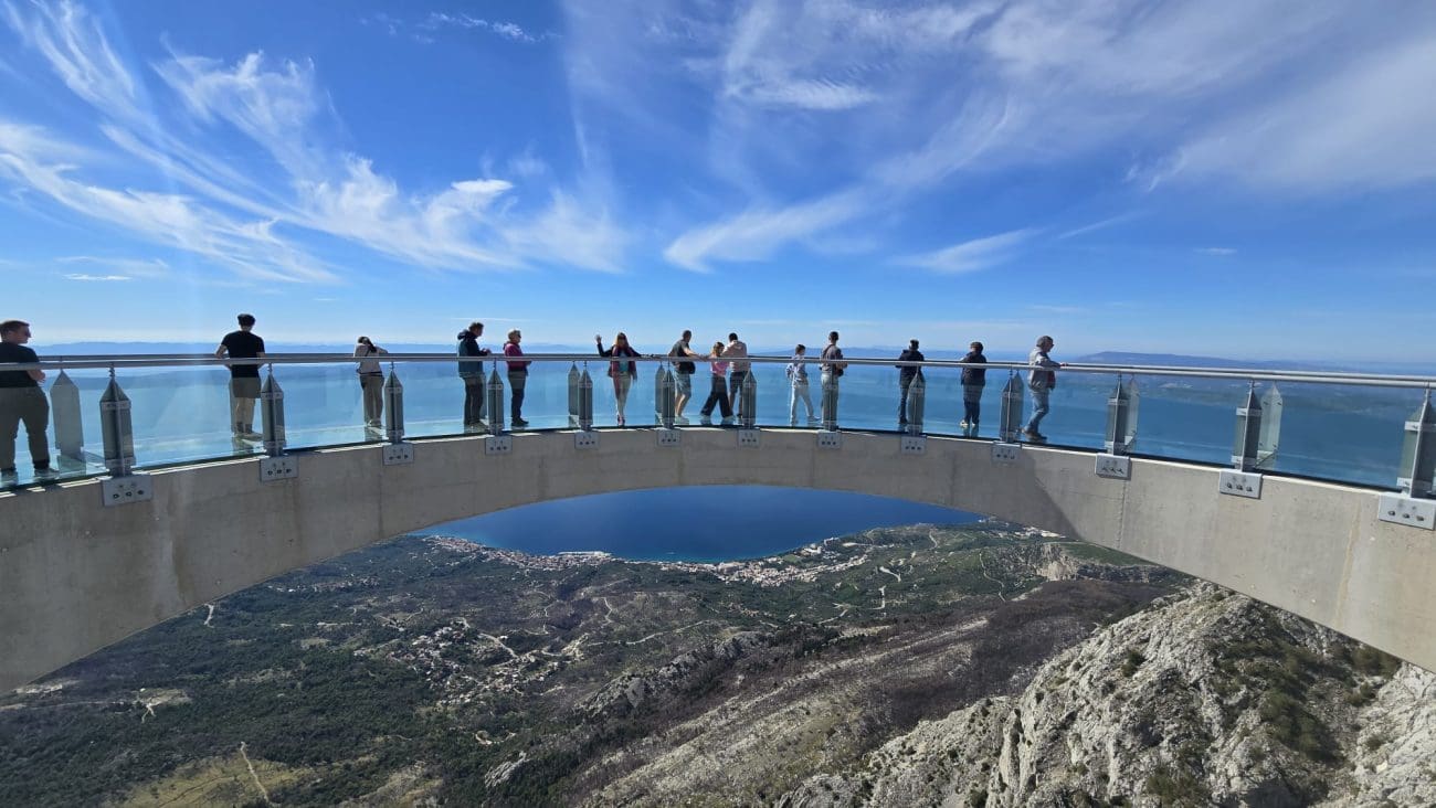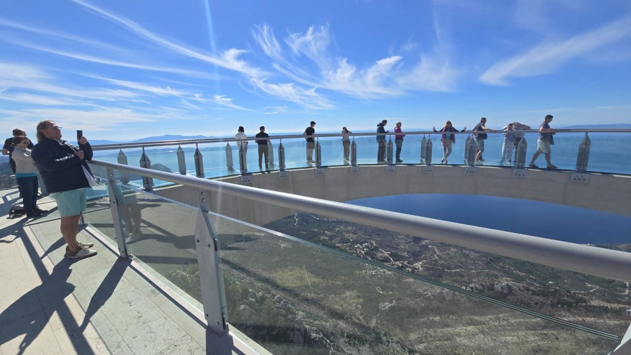 Smješten na 1228 metara nadmorske visine, ovaj stakleni vidikovac u Parku prirode Biokovo nudi nezaboravan pogled na makarsku rivijeru, otoke, a za vedrih dana čak i talijansku obalu s druge strane Jadrana. Danas su ga posjetili brojni domaći i strani turisti, ali i lokalni izletnici koji su odlučili iskoristiti idealne vremenske uvjete za boravak u prirodi.