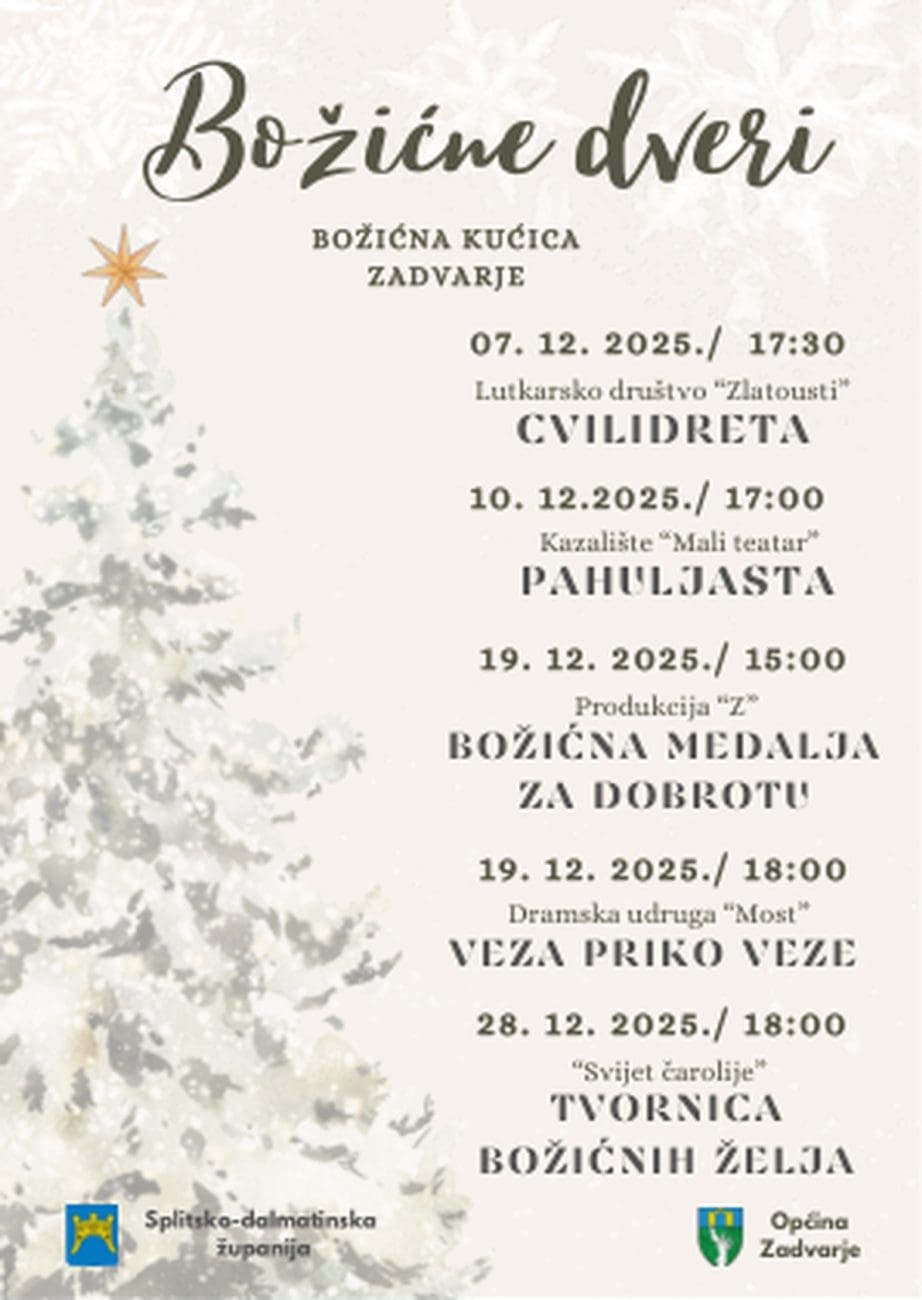 Općina Zadvarje priprema bogat prosinački kulturno-zabavni program u sklopu manifestacije Kulturna zima u Zadvarju, koja donosi niz predstava i blagdanskih događanja za djecu i odrasle. Program je dio kulturne inicijative kroz projekt JEZIK Splitsko-dalmatinske županije, kojim se omogućava dostupnost i približavanje kulturnih sadržaja u manjim sredinama s ograničenim pristupom kulturnim izričajima.