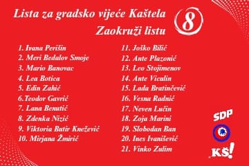 Koalicija “Zajedno za pravedno”, koju čine SDP i stranka “Hoćemo pravedno”, s ponosom predstavlja listu kandidatkinja i kandidata za Gradsko vijeće Grada Kaštela. Na čelu liste je Ivana Perišin, predsjednica SDP-a Kaštela i kandidatkinja za gradonačelnicu. Riječ je o ljudima različitih iskustava i pozadina, ali s jednom zajedničkom točkom – dubokom željom da Kaštela postanu pravedan, uređen i održiv grad za sve svoje stanovnike.