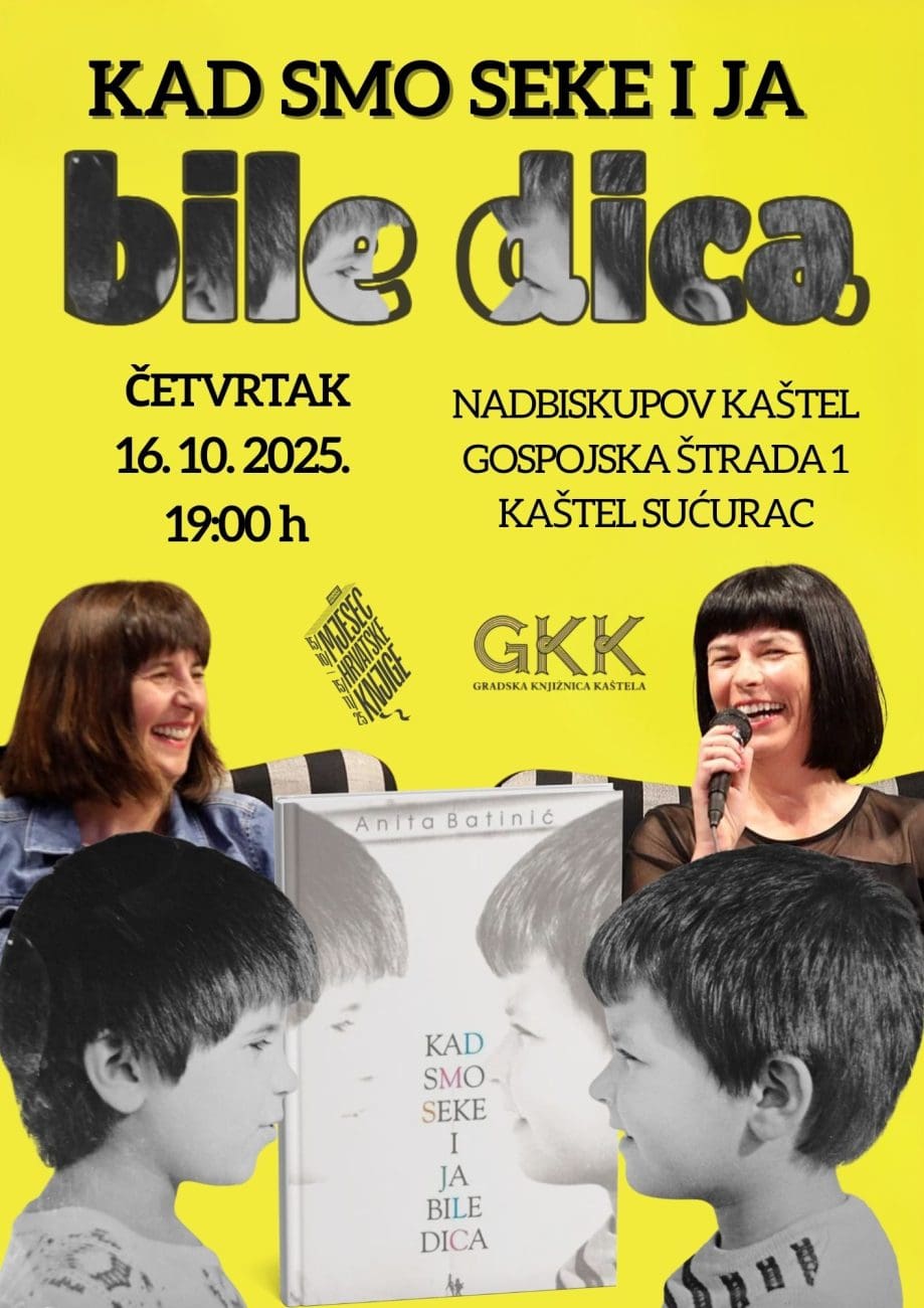 Gradska knjižnica Kaštela poziva sve ljubitelje pisane riječi na predstavljanje knjige "Kad smo seke i ja bile dica" autorice Anite Batinić. Knjiga će biti predstavljena u četvrtak, 16. listopada, s početkom u 19 sati u Nadbiskupovom kaštelu u Kaštel Sućurcu, na adresi Gospojska štrada 1.