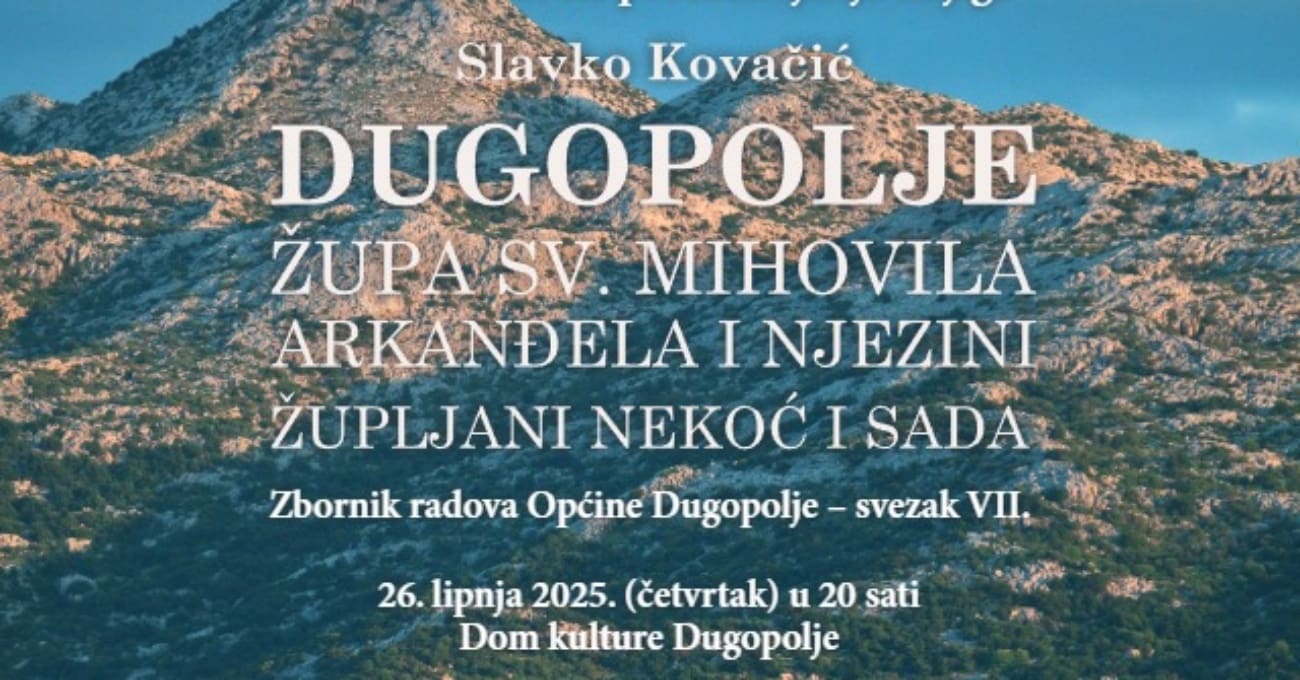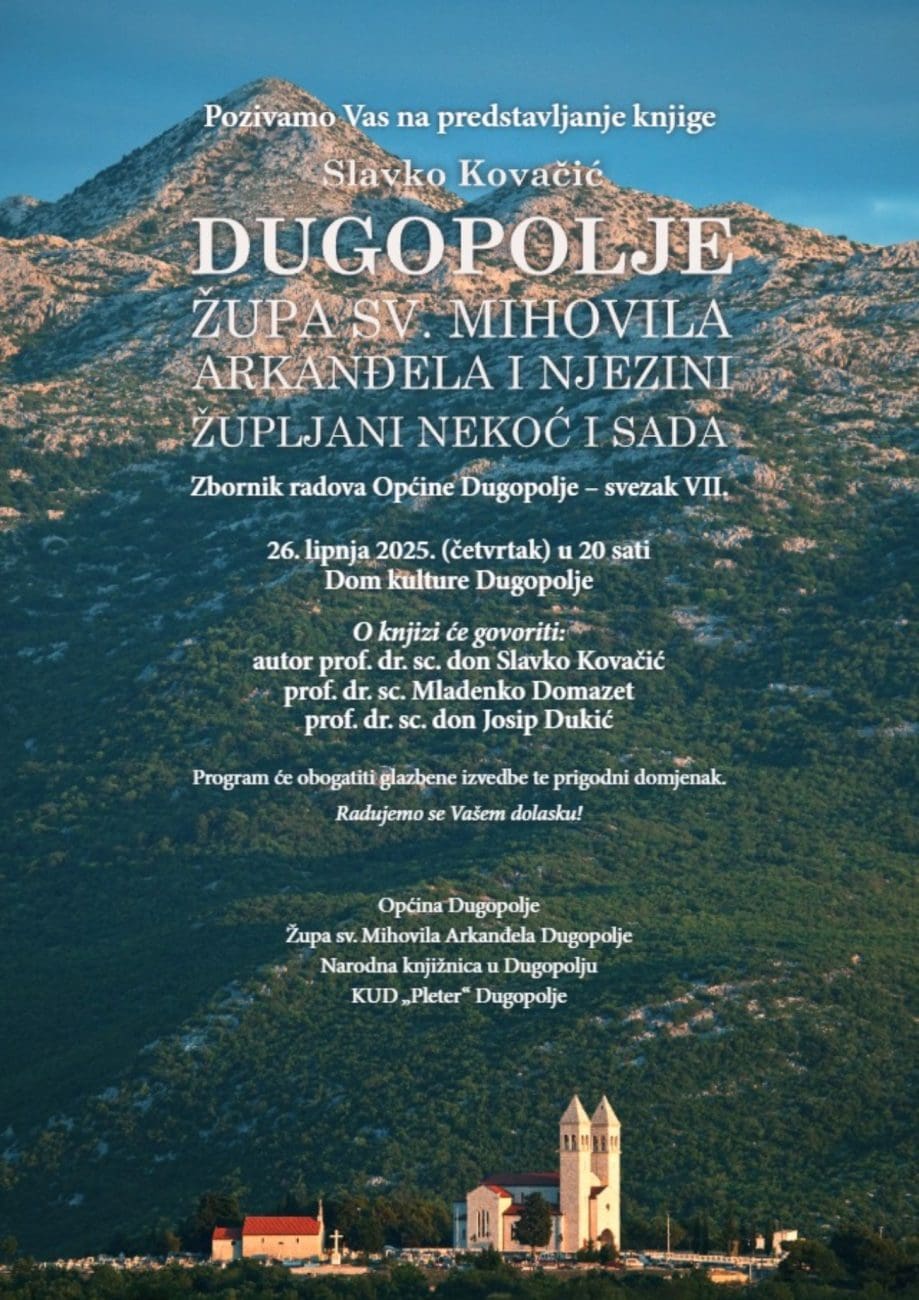 U četvrtak, 26. lipnja, u dvorani Doma kulture u Dugopolju s početkom u 20 sati bit će predstavljena knjiga „Dugopolje – Župa sv. Mihovila Arkanđela i njezini župljani nekoć i sada“, autora don Slavka Kovačića – uglednog hrvatskog znanstvenika, crkvenog povjesničara i arhivista.