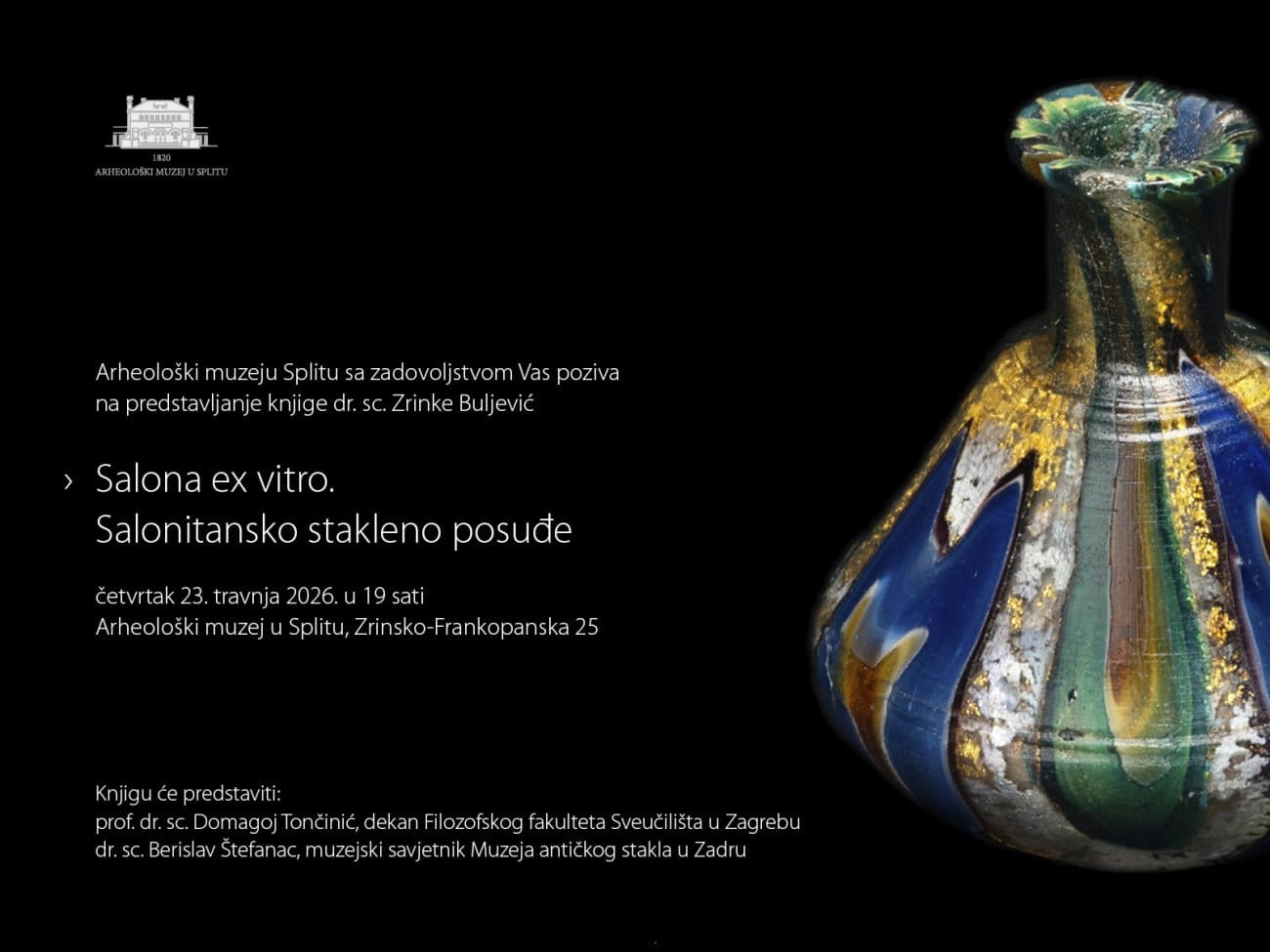 Arheološki muzej u Splitu poziva na predstavljanje knjige Salona ex vitro. Salonitansko stakleno posuđe autorice dr. sc. Zrinke Buljević, muzejske savjetnice, koje će se održati u četvrtak, 23. travnja 2026. godine s početkom u 19 sati u Arheološkom muzeju u Splitu.