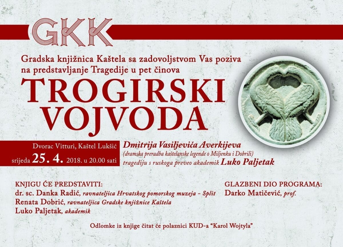 Gradska knjižnica Kaštela sa zadovoljstvom Vas poziva na predstavljanje tragedije u pet činova "Trogirski vojvoda" autora Dmitrija Vasiljeviča Averkijeva, a koja je dramska preradba poznate kaštelanske legende o Miljenku i Dobrili.
