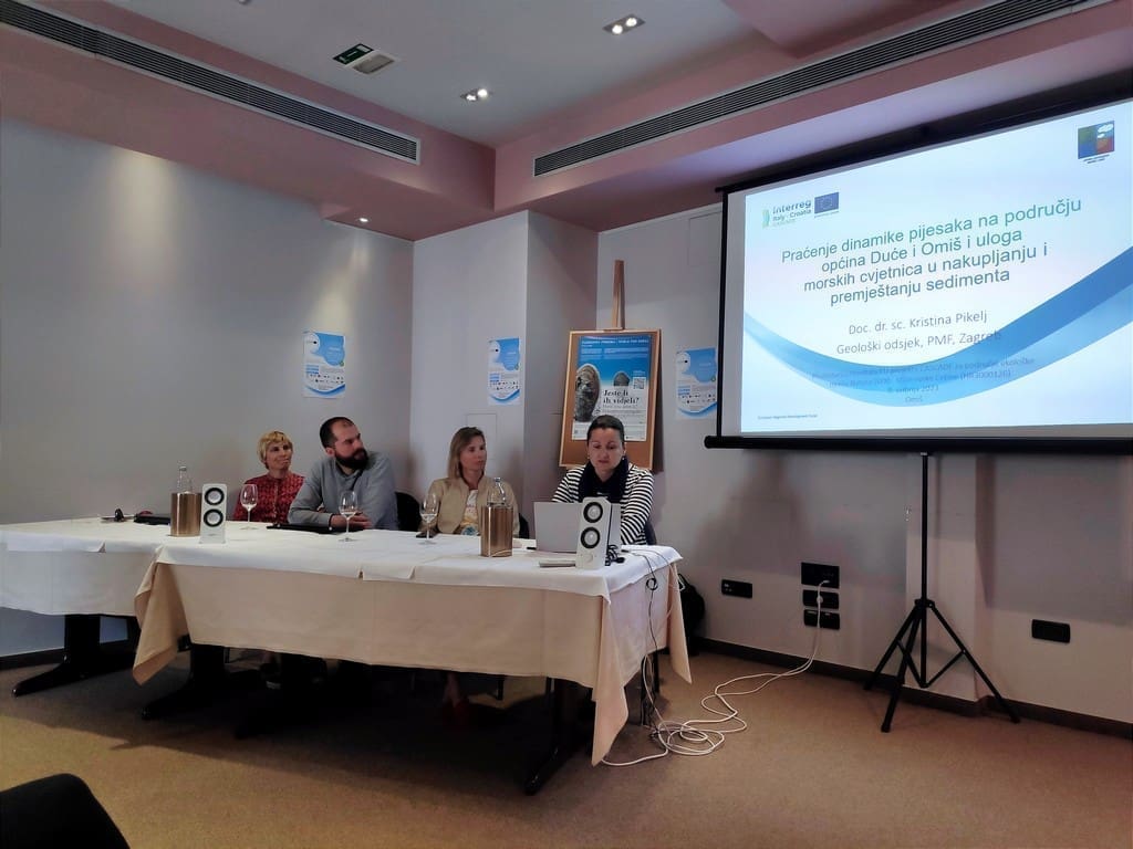 O praćenju dinamike pijesaka na području općine Duće i grada Omiša te o ulozi morskih cvjetnica u nakupljanju i premještanju sedimenta govorila je Kristina Pikelj sa zagrebačkog PMF-a pa se tako moglo saznati kako morske cvjetnice stvaraju bistru vodu, ublažavaju valove, zadržavaju sediment te na taj način čuvaju obalu od erozije. Većina naše obale je od tvrđih karbonatnih stijena, a samo manji dio je građen od mekših klastita (fliš i sl.), dok su plaže iznimka, a ne pravilo. U analizi sedimenta s plaže u Dućama zaključilo se kao se radi o šljunkovitom pijesku, u prosjeku 89% karbonatnom pijesku, dominiraju komadići stijena te su u manjoj mjeri zastupljeni ostaci morskih i fosilnih organizama. Kod dohranjivanja obale i plaža, jako je važno uzeti u obzir karakteristike same obale odnosno individualnu geomorfologiju područja i orijentaciju plaže. Naročito bitni za skladištenje i očuvanje sedimenta su naslage morske vegetacije (poput listova čvoraste morske rese) koja se ne bi smjela uklanjati s plaže.