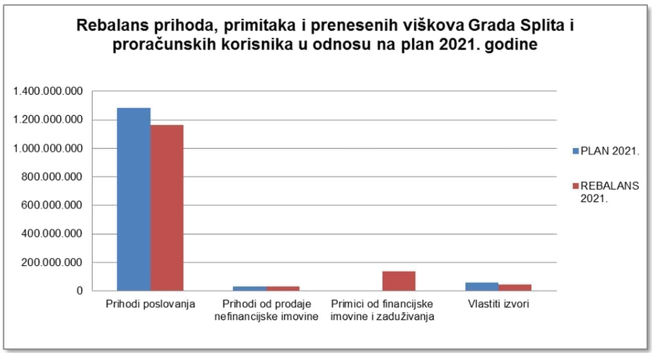 Kako je objašnjeno u prijedlogu, prihodi proračuna planirani ovim Izmjenama i dopunama za 2021. godinu u iznosu od 1,194 milijardi kuna temelje se na dosadašnjem kretanju prihoda uvažavajući donesene mjere Grada Splita uslijed pandemije koje su bile na snazi do 31.08.2021. godine, a utjecale su na izostanak planiranih prihoda.