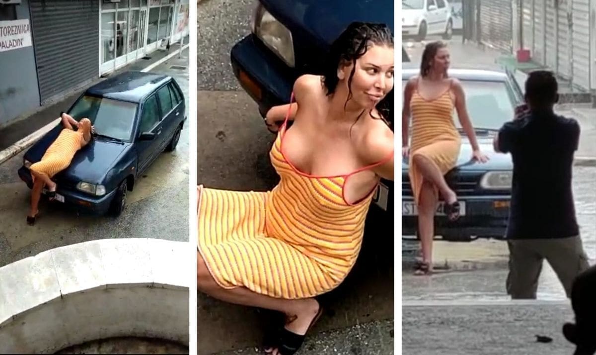 Naime, na snimci je vidljivo kako Ava na kiši izvodi seksi poze na automobilu, a sve na nagovor lokalne skupine muškaraca.