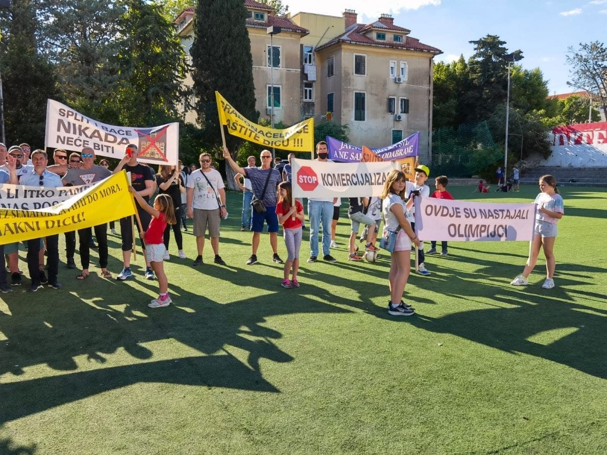 UGOVOR O KONCESIJI NA ŠKOLSKO IGRALIŠTE ističe krajem ove godine i ovim prosvjedom tražimo od svih institucija, nadležnih službi Grada Splita, vodstva škole na čelu s ravnateljem i školskim odborom, i od novog gradonačelnika da nam daju čvrstu garanciju, da se ovako nešto više nikada ni u ludilu neće ponoviti i da će se ovo 'ruglo' od terena preurediti, ukloniti polovna, istrošena trava, ukloniti ogromne i opasne mate koje okružuju igralište i ono što je najvažnije od svega, jednom zauvijek se skinuti KATANAC sa vrata i da igralište bude uvijek otvoreno za sve!