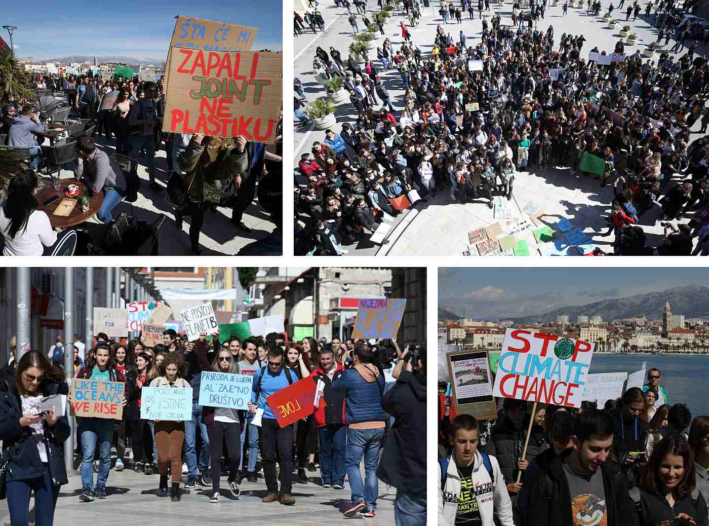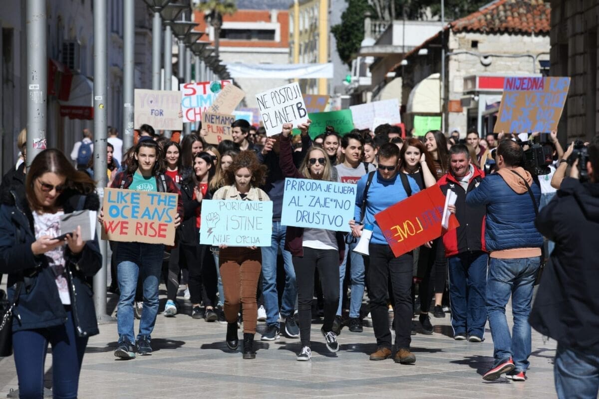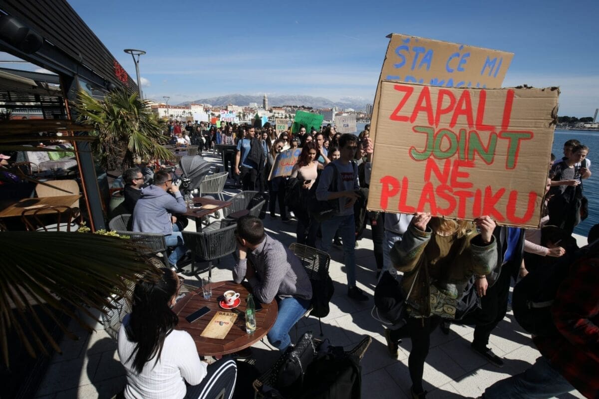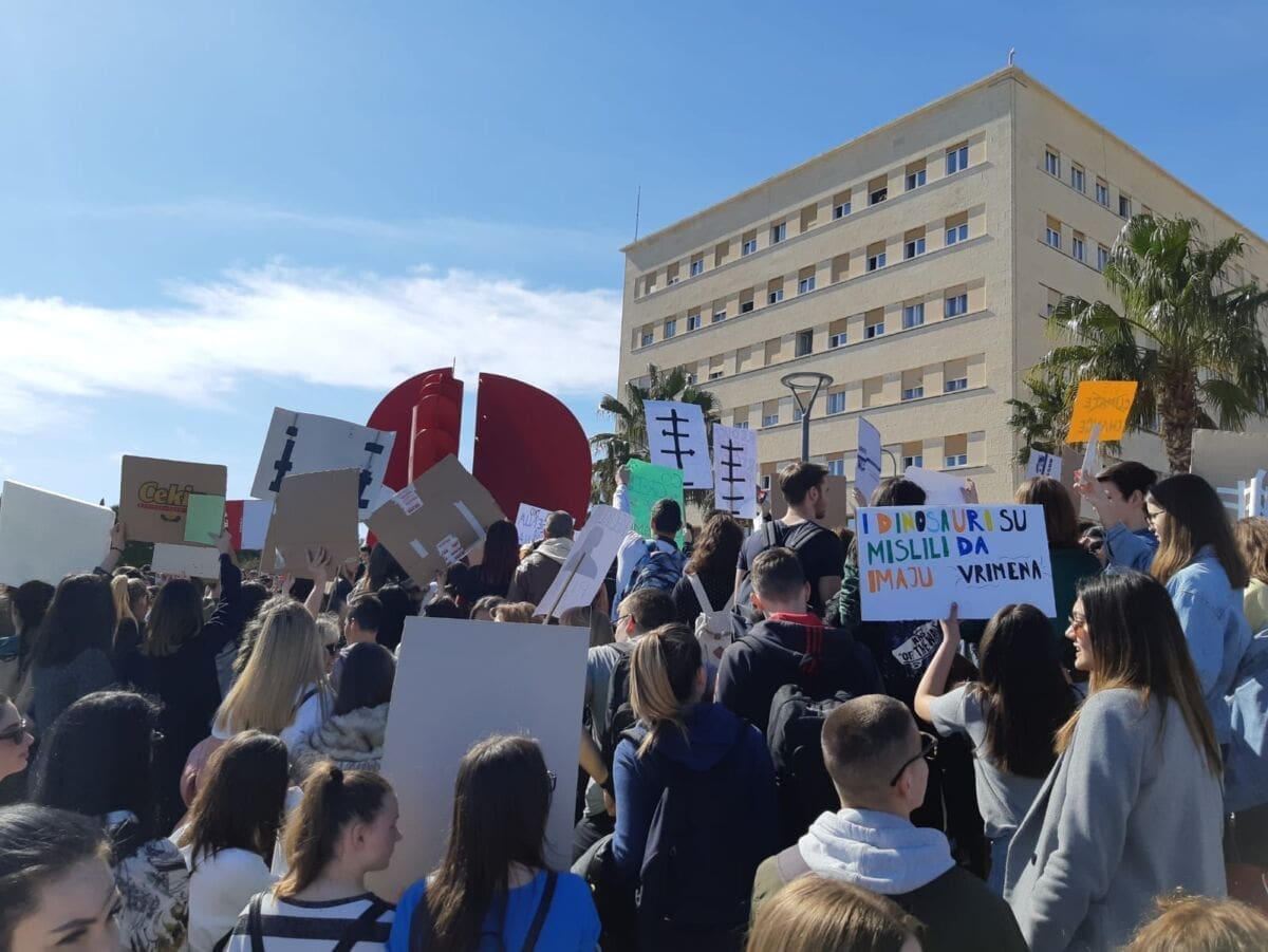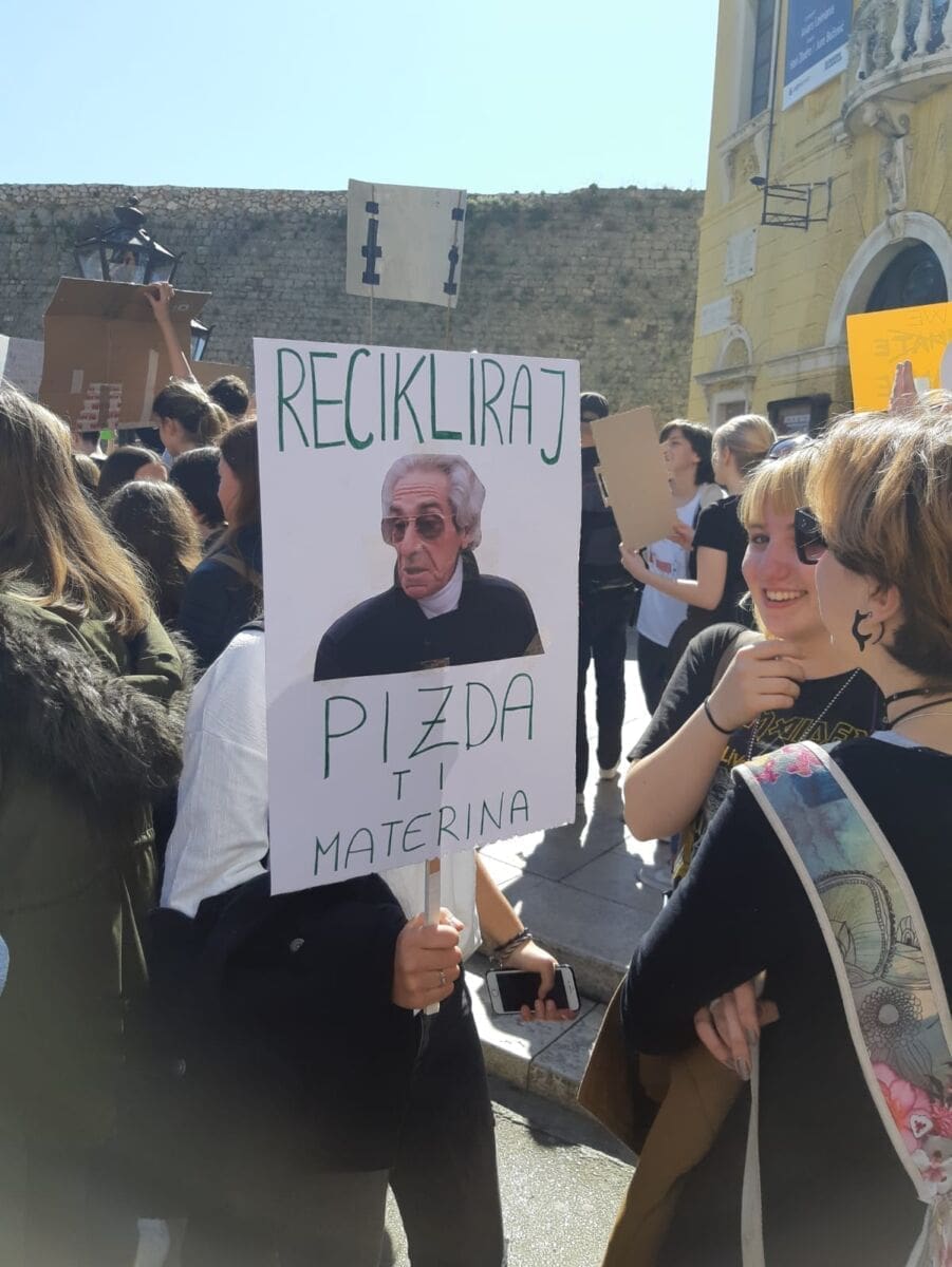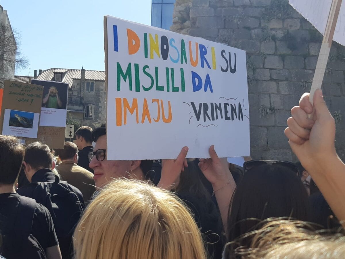 "I dinosauri su mislili da imaju vrimena", "Recikliraj, ***da ti materina", "Ovo je doba globalnog zatopljenja i ljudske hladnoće", "Budi dio rješenja, ne dio zagađenja", "Zašto učimo za budućnost koju nećemo imati?" - samo su neki od brojnih transparenata koje su nosili prosvjednici.