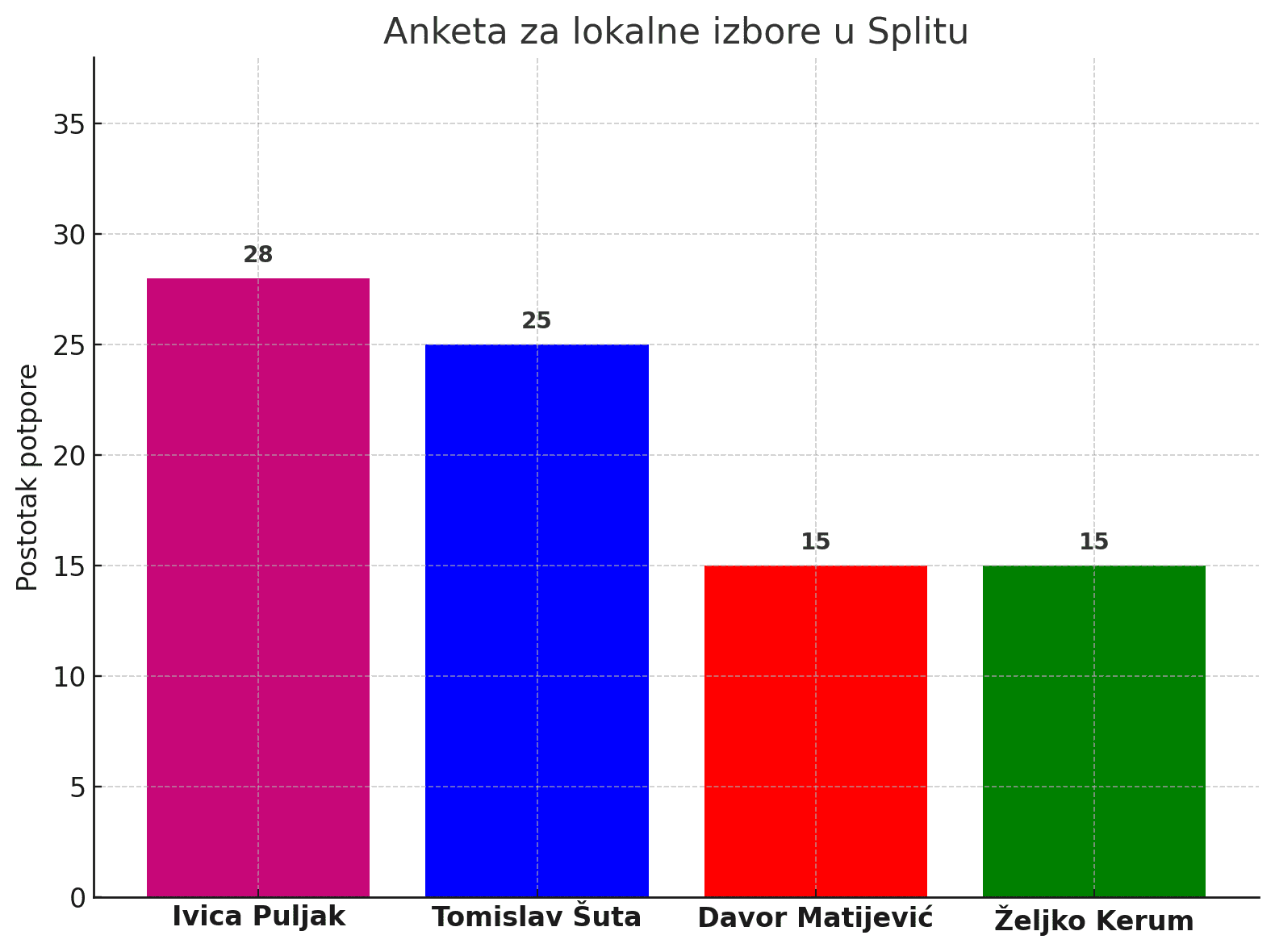 Prema informacijama koje smo saznali iz najnovijih istraživanja koje je proveo splitski HDZ, aktualni gradonačelnik bilježi pad u odnosu na posljednju anketu te se trenutačno ima podršku od 28 posto. Odmah iza njega je kandidat HDZ-a s 25 posto , dok se s 10 posto manje nalazi SDP-ov kandidat Davor Matijević, koji je izjednačen s Kerumom – obojica imaju po 15 posto.
