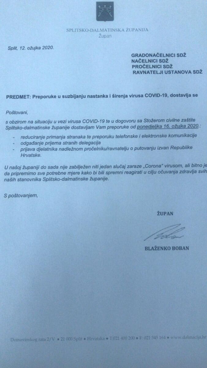 Župan Splitsko-dalmatinske županije Blaženko Boban uputio je jutros gradonačelnicima, načelnicima, pročelnicima i ravnateljima ustanova u županiji preporuku o suzbijanju nastanka i širenja virusa COVID-19.