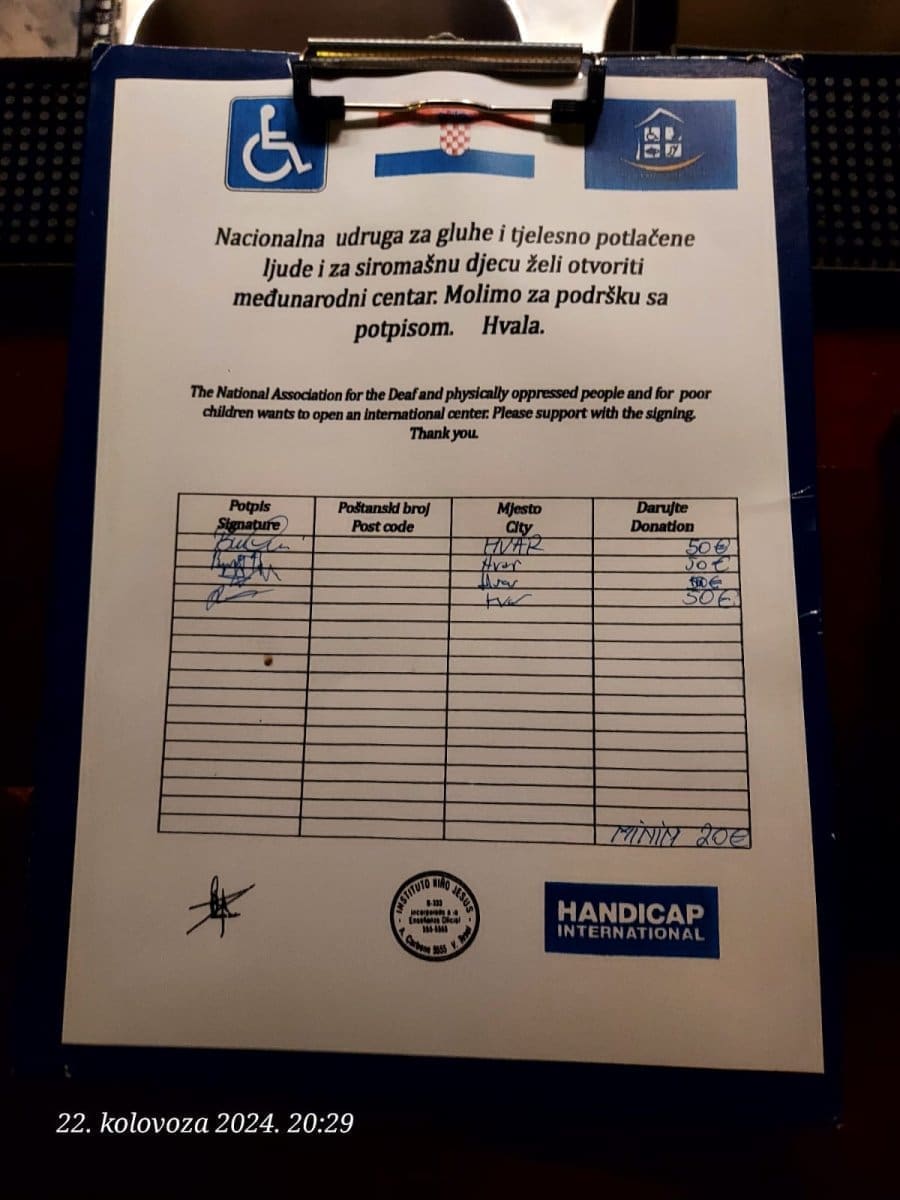 Na papiru koji prevarantica nosi navodi se da Nacionalna udruga za gluhe i tjelesno potlačene ljude i za siromašnu djecu skuplja novac za izgradnju međunarodnog centra te skuplja potpise i donacije. Navodi se da je minimalna donacija 20 eura, a na slici se vidi da su neki nažalost povjerovali i prevarantici dali novac.