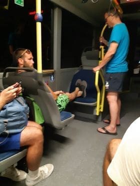 Ispružio se kao da je doma u krevetu. Da stvar bude još gora, upravo pored tog sjedala na kojem je držao noge, muškarac srednjih godina stajao je na nogama držeći se za rukohvat.