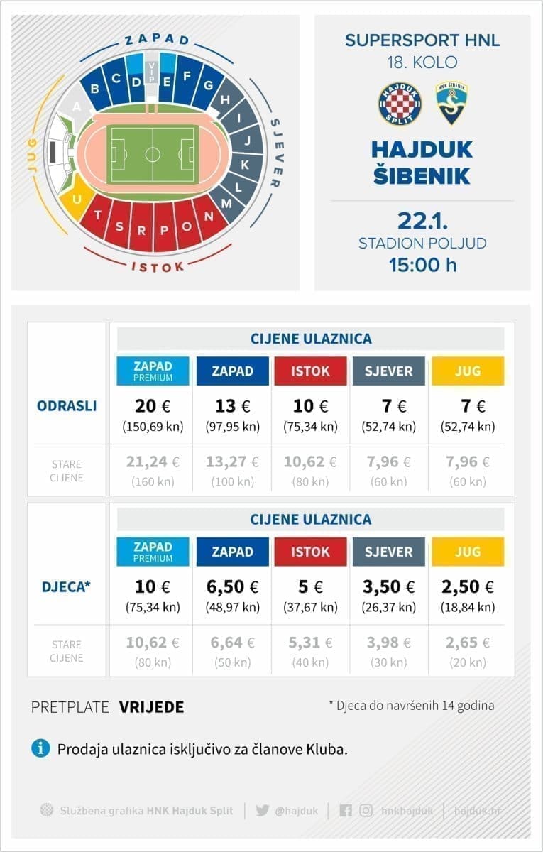 Odlukom Uprave Kluba s obzirom na promjenu službene valute u Republici Hrvatskoj (iz kune u euro) cijene ulaznica se za pojedine tribine nisu mijenjale, štoviše, nešto su umanjene u odnosu na proteklu polusezonu što možete vidjeti u grafici ispod.