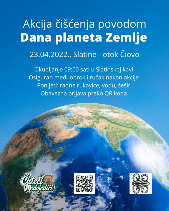 U subotu 23.travnja 2022. u 9 sati u Slatinskoj kavi na otoku Čiovu volonteri i volonterke Čistećih medvjedića i Udruge Baština Slatine održat će akciju čišćenja povodom Dana planeta Zemlje kojom ćemo upozoriti na zagađenje uzrokovano ljudskim ponašanjem.