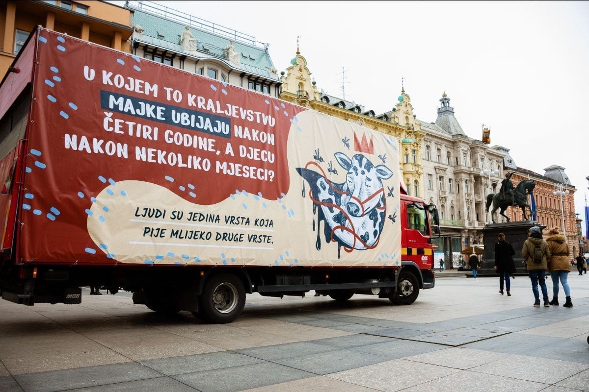 Velikom edukativnom instalacijom u središtu Zagreba Prijatelji životinja otkrili su građanima što se događa s kravama i telićima u mliječnoj industriji. Prolaznike na Trgu bana Jelačića iznenadili su kamionom s velikim vizualima izvana i videoprikazom unutar kamiona. Poruke na vanjskim vizualima kamiona mnoge su zapanjile, iako se radi o općim informacijama kojih bi svi trebali biti itekako svjesni. Građani su zavirivali u kamion, a time i u mukotrpan život krava u mliječnoj industriji.