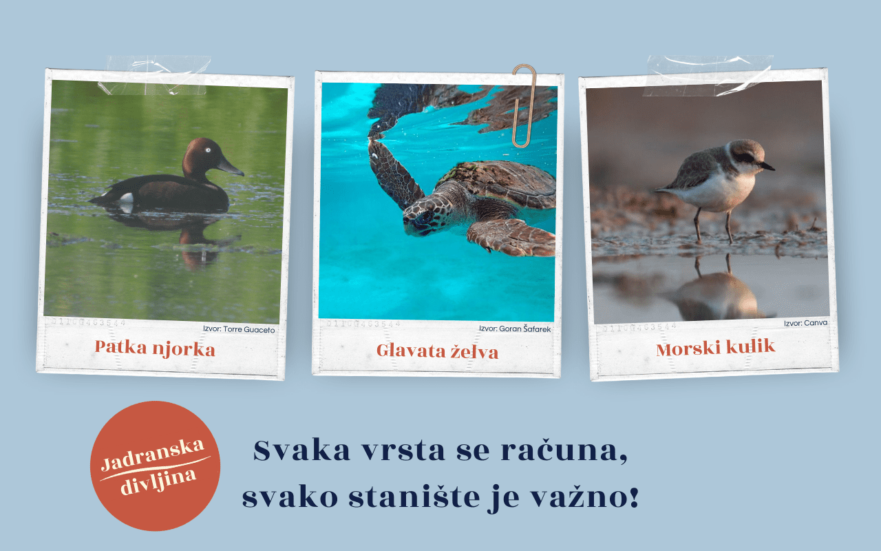Usredotočeno na glavatu želvu (Caretta caretta), patku njorku (Aythya nyroca) i morskog kulika (Charadrius alexandrinus). Pokaži nam ove vrste u njihovom prirodnom okruženju!