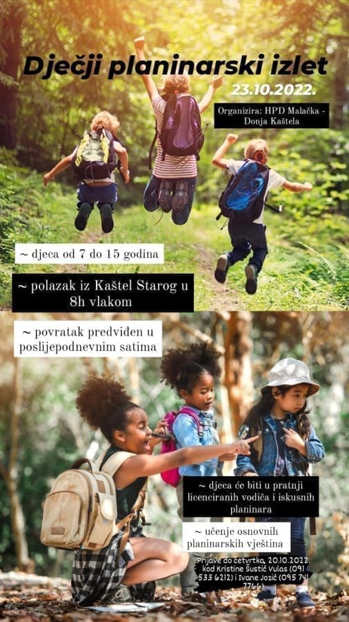 U nedjelju, 23. listopada, u organizaciji HPD Malačka, održat će se prvi dječji dječji planinarski izlet za sve zainteresirane u dobi od 7 do 15 godina, bez obzira jesu li članovi planinarskog društva ili ne.