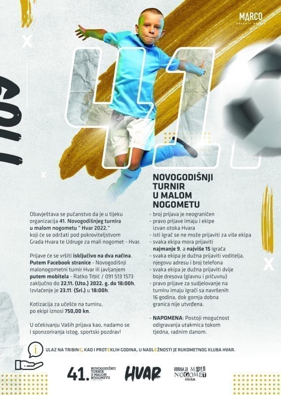 Udruga za mali nogomet Hvar, po četrdeset i prvi put organizira turnir u malome nogometu. Prijave traju do 22.11.2022, a izvlačenje parova 23.11.2022.
