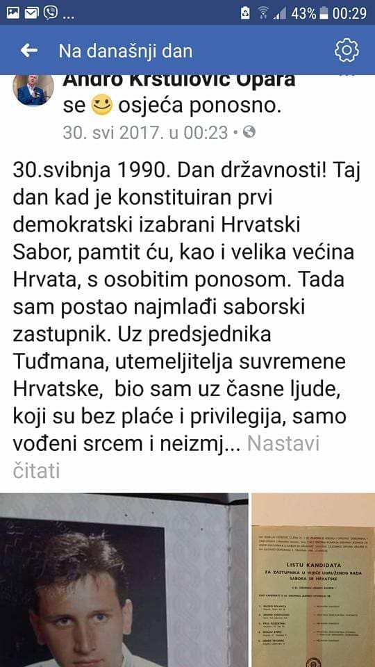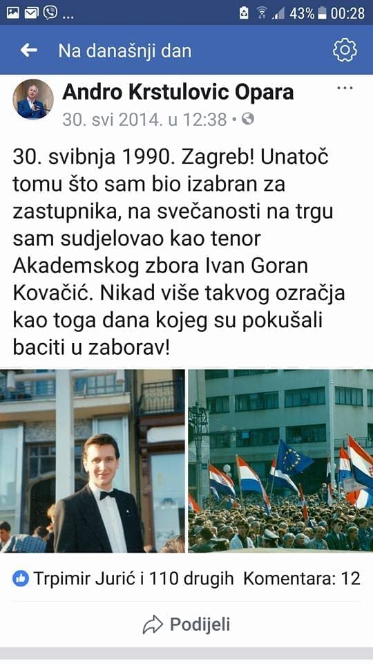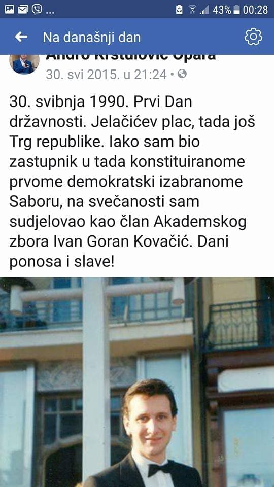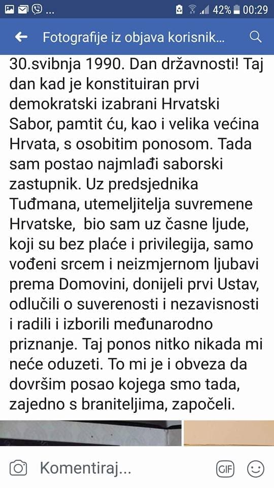 Dan kada smo bili ponosni, kada smo znali što obilježavamo, čega se prisjećamo i što slavimo. Osjećaj je bio sličan onome kojega imamo danas za 5.kolovoza- za Dan pobjede i Domovinske zahvalnosti te za Dan hrvatskih branitelja, kojega mi danas u Splitu obilježavamo. Radno i svečano." - napisao je gradonačelnik, a priložio je nekoliko screenshotova njegovih objava iz lanjskih godina, uključujući onaj na kojem se mogu vidjeti fotografije snimljene 30. svibnja 1990. godine kada je, iako je izabran za zastupnika, pjevao na trgu u Zagrebu u ulozi tenora Akademskog zbora Ivana Gorana Kovačića.