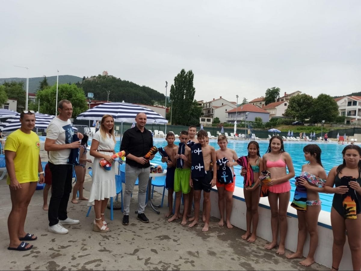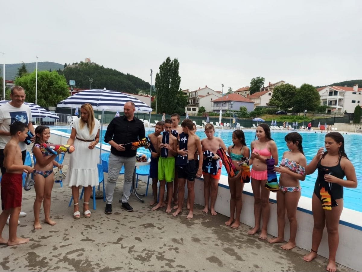 Tom prigodom su dogradonačelnik Grada Sinja Denis Bobeta, direktorica Kamička Marina Cvitković i voditelj Gradskog bazena Stipe Blajić darivali najmlađe kupače ručnicima za plažu.