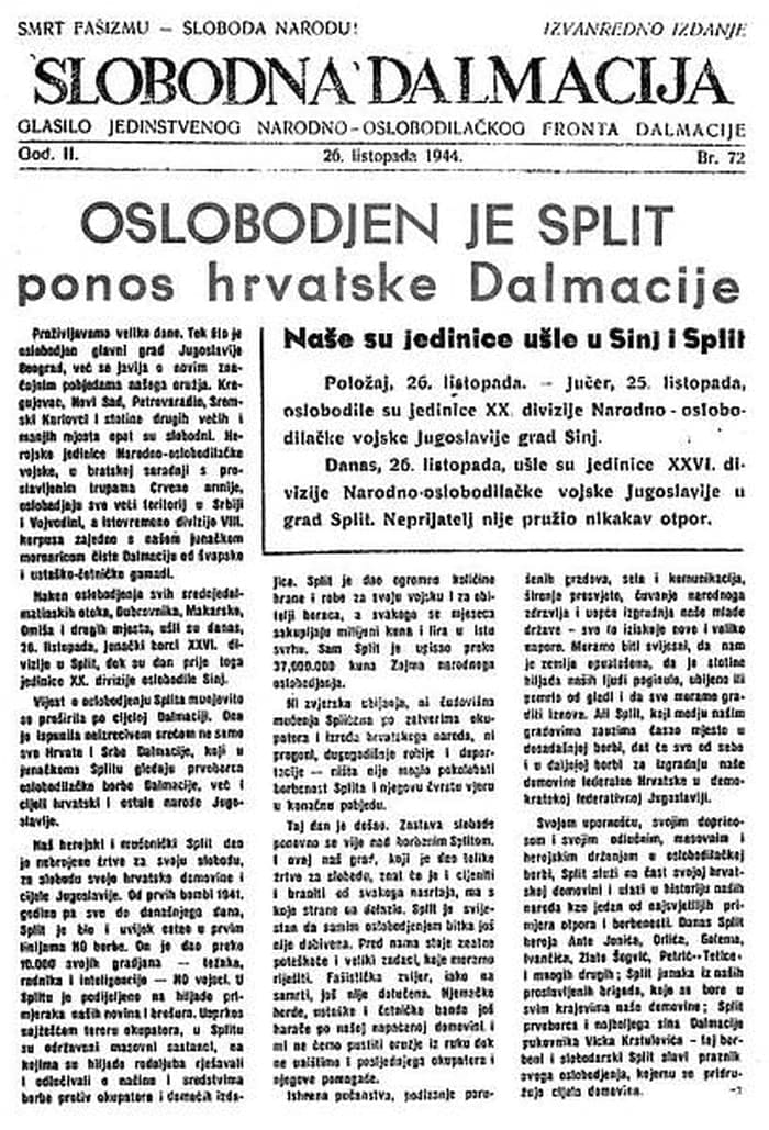 Naslovnica Slobodne Dalmacije nakon oslobođenja Splita
