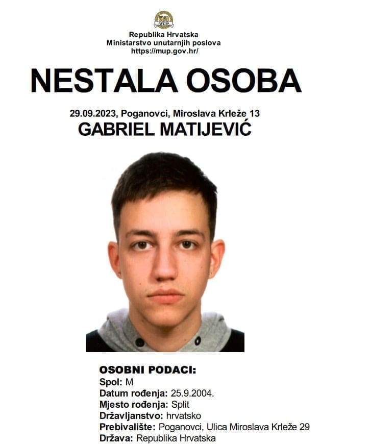 U potragu za mladićem uključeno je 40-ak dobrovoljaca uz policiju, vatrogasce i HGSS. Gabriel Tatić Matijević visok je 185 centimetara, a u četvrtak, kada je nestao, otišao je u automobilu crvene boje marke Peugeot 206.