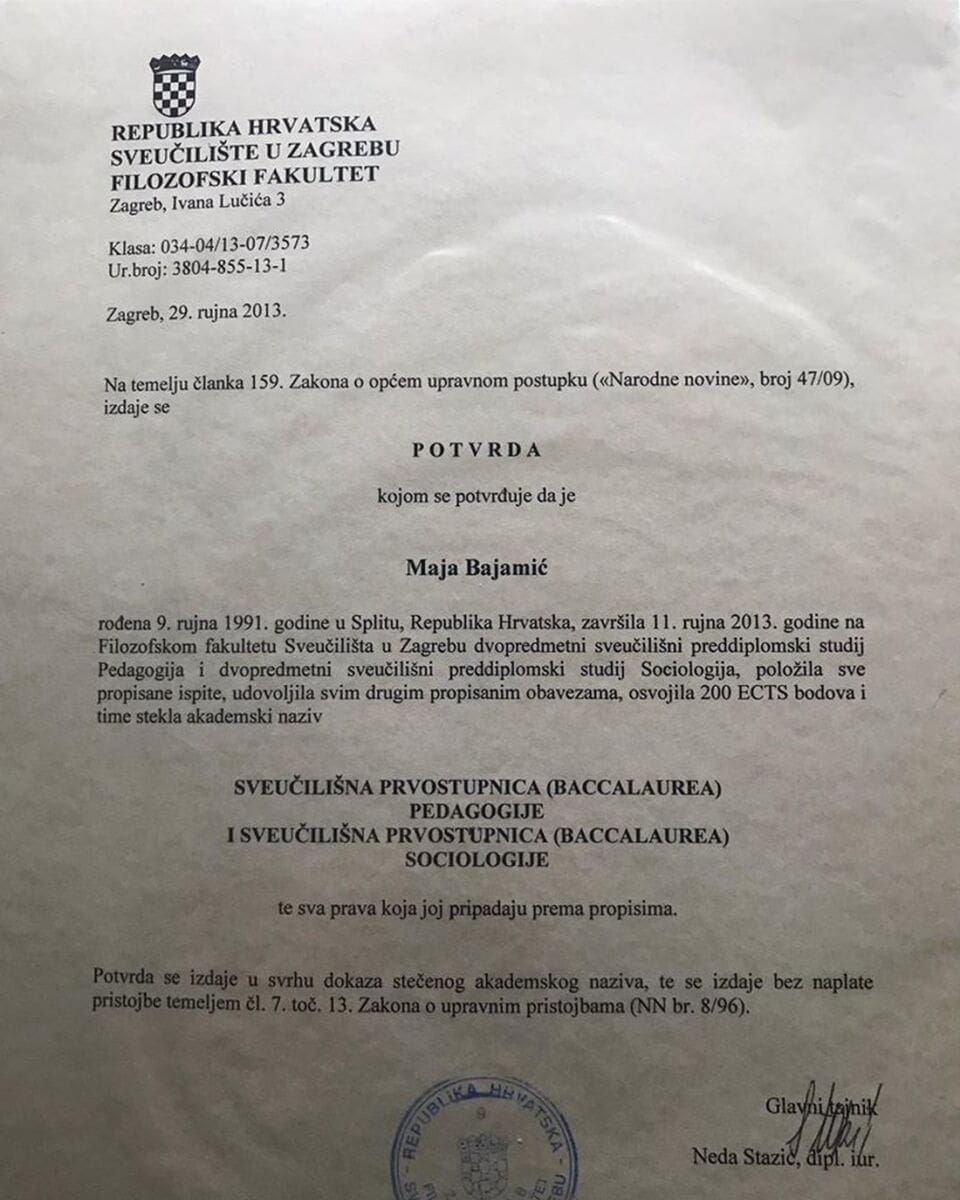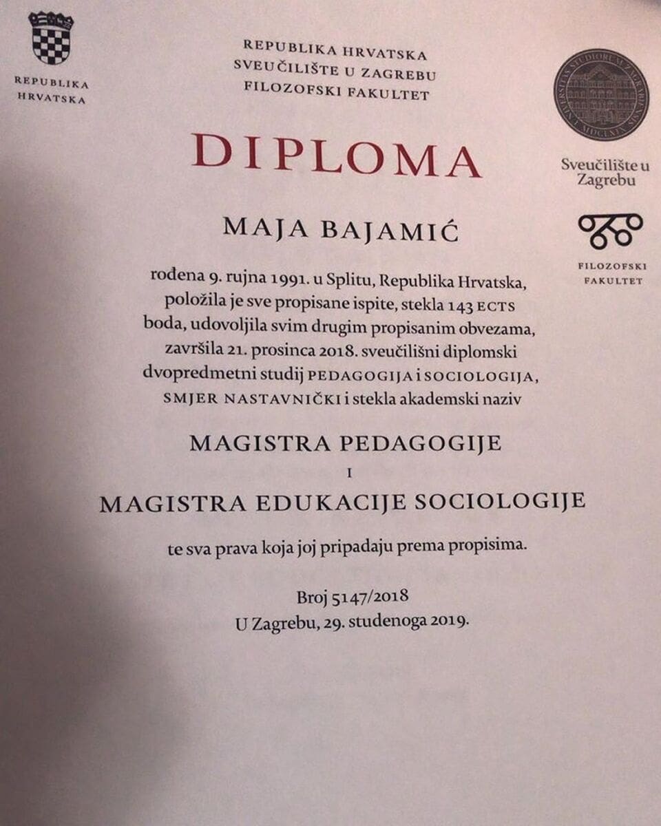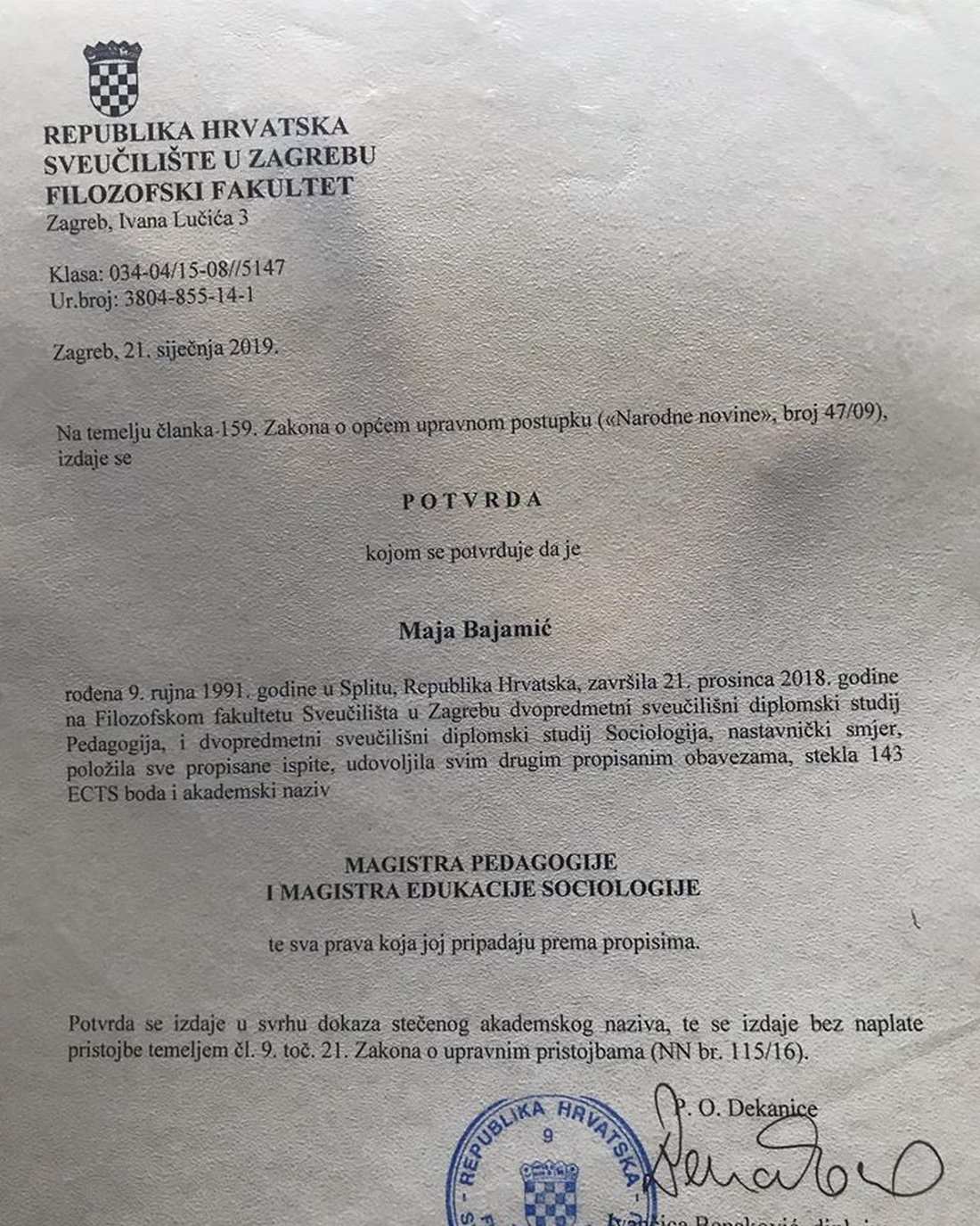 Maja je jučer na Filozofskom fakultetu u Zagrebu primila diplomu, a pohvalila se i fotografijama s promocije.
