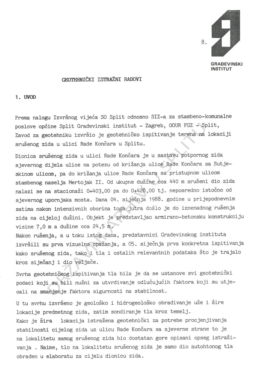 No, predstavnici Građevinskog instituta bili su puno decidiraniji i brži. Njihovi predstavnici praktički odmah su, istog dana, obavljali prva vizualna opažanja na mjestu pada armirano-betonske konstrukcije. Idućih dana i mjeseci obavili su konkretna ispitivanja tla (geotehničko) sondiranje temelja zida, te geološki i hidrogeološki obradili užu i širu lokaciju zida, ali i samu armaturu.